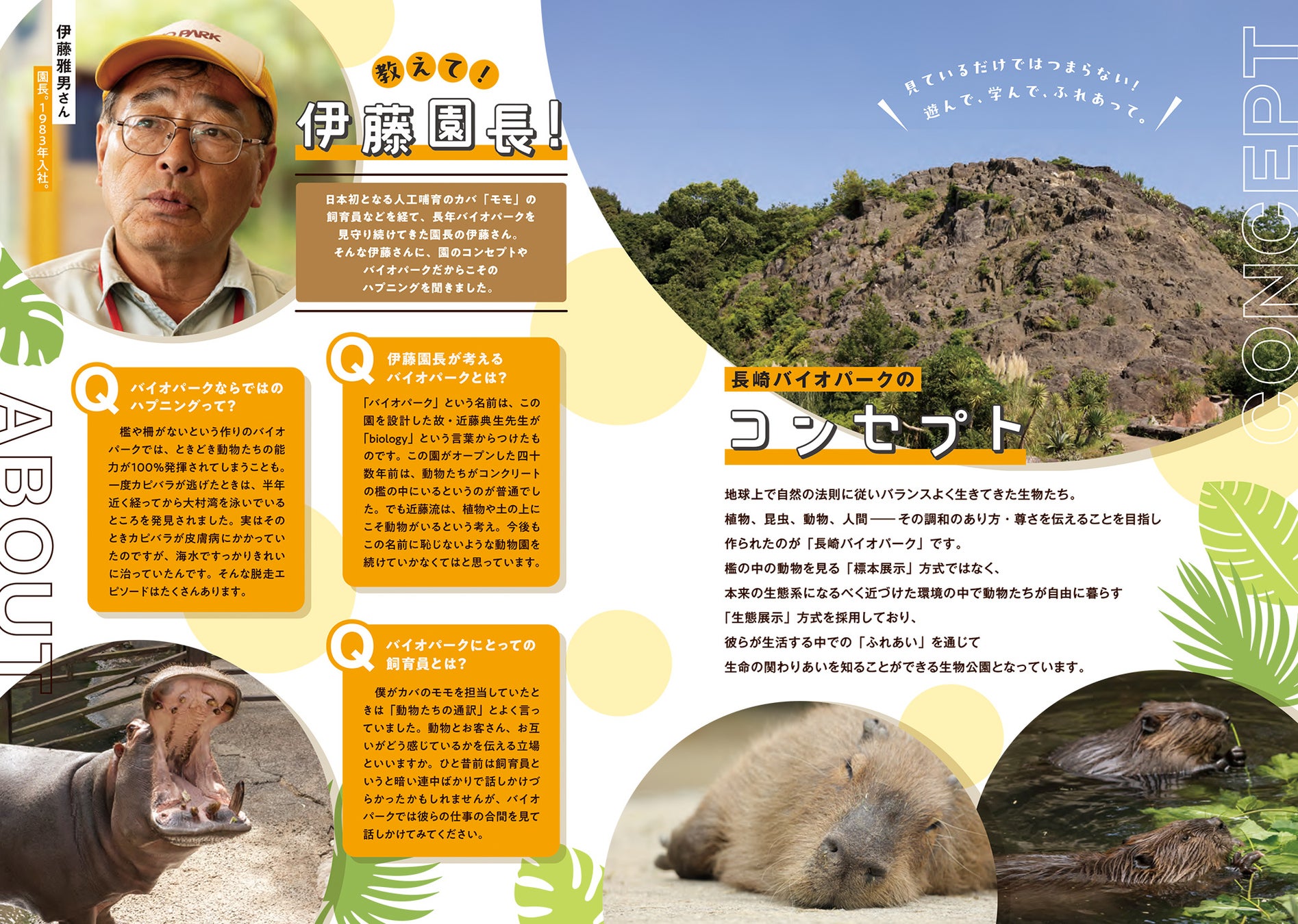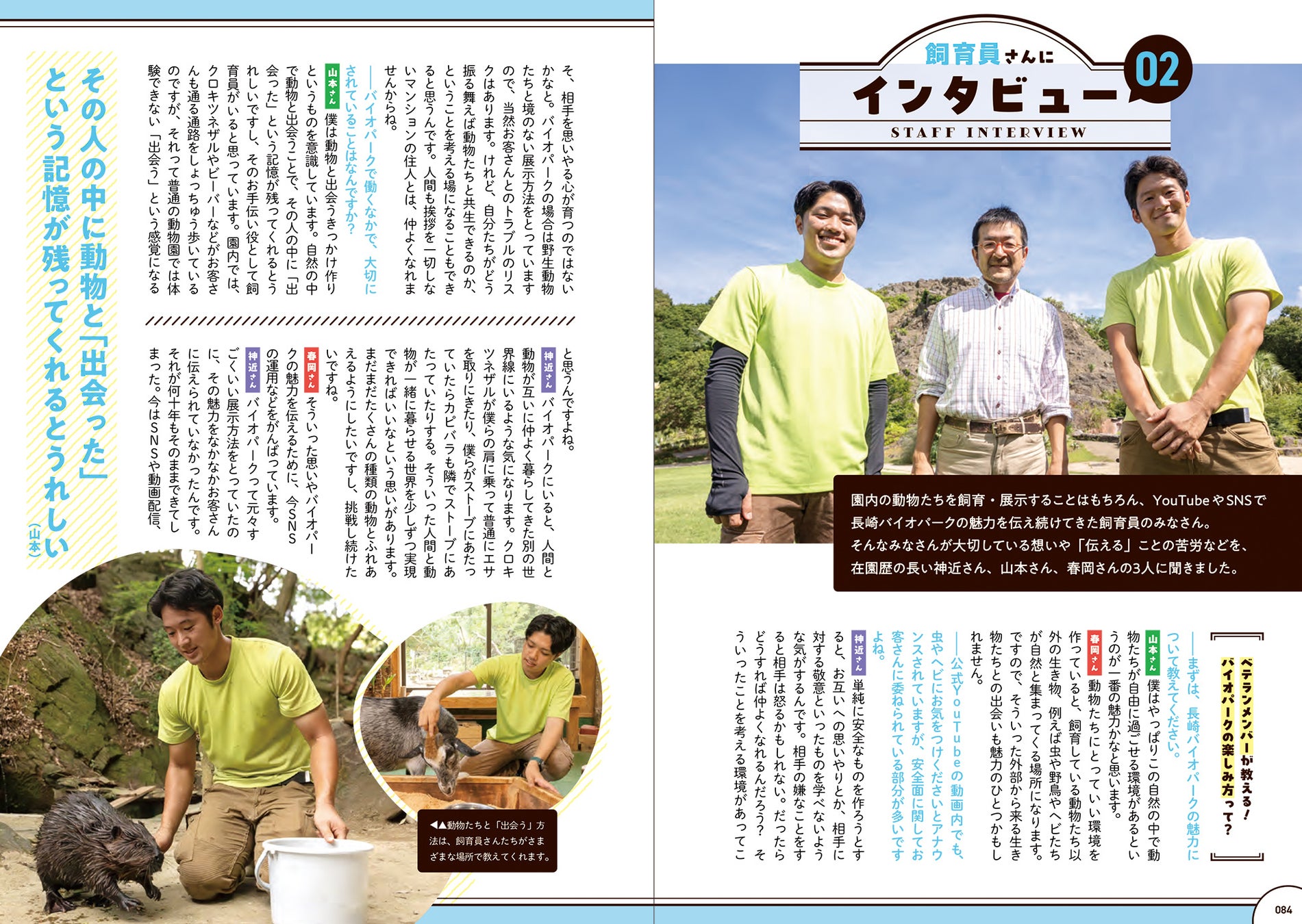 イヌ、モルモット、飼育員(?)など長崎バイオパークに欠かせない存在の撮りおろし写真もたっぷりお届け。さらに、動物園の持つ役割やSNS運用についての考えなど飼育員さんや伊藤園長にもじっくり取材しました。