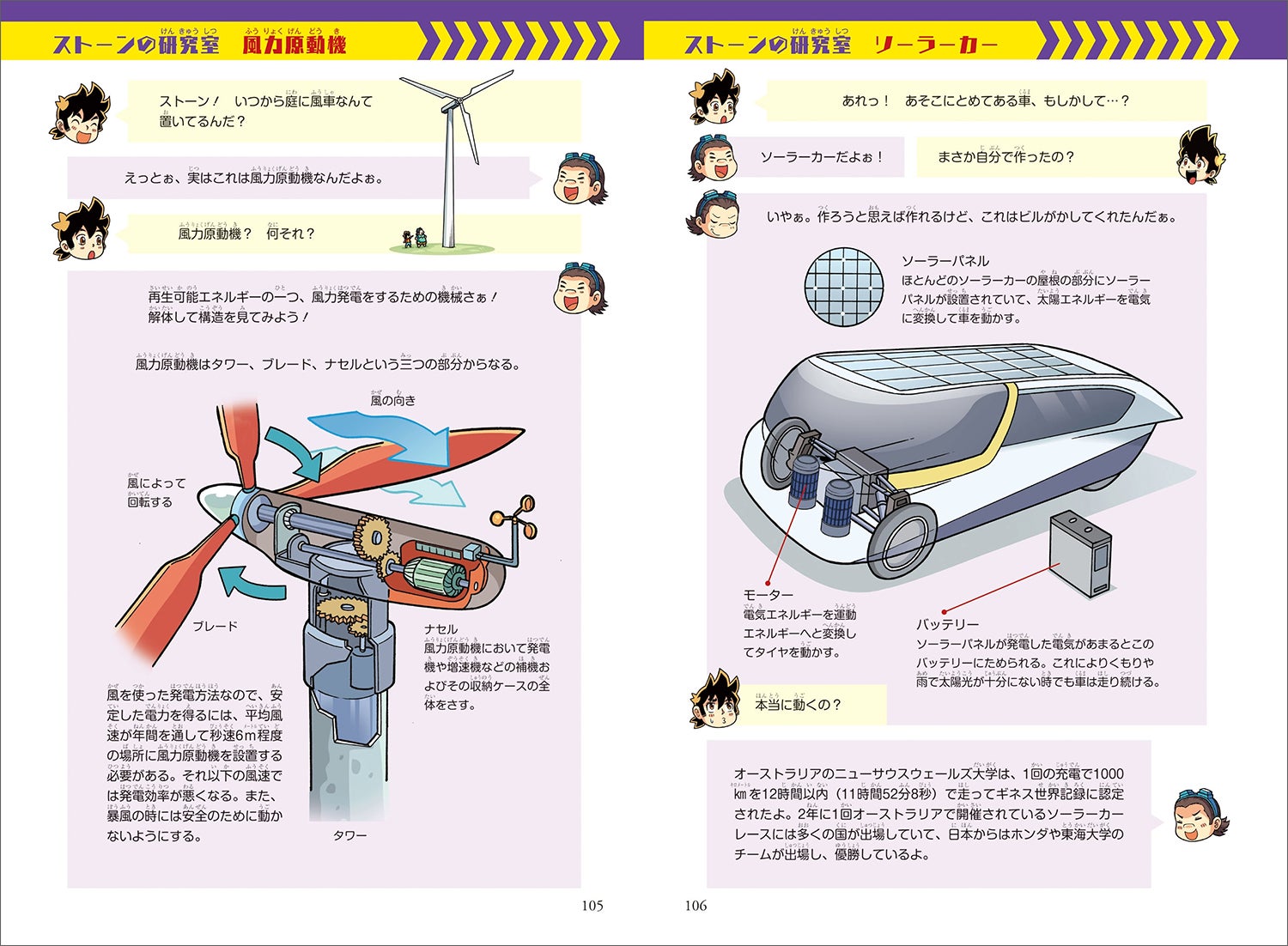 ソーラーカーや風力原動機などのビジュアル満載のイラストや図解により、子どもたちが楽しみながら科学知識を身に付けることができます。