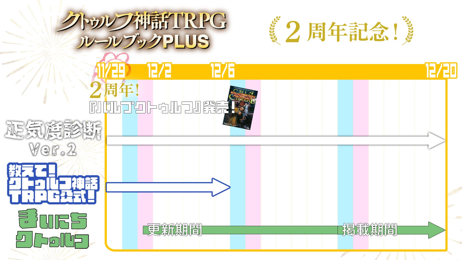 これを記念して、1周年にて大好評だった「正気度診断」がパワーアップして登場する「正気度診断 Ver.2」や、皆さんの疑問にアーカム・メンバーズを含めた公式がお答えする質問企画「あなたの疑問にクトゥルフ神話TRPG公式がお答えします!」、期間限定で占いやコラムが毎日更新される「まいにちクトゥルフ」など、2周年を盛り上げるいろいろな企画を開催いたします。