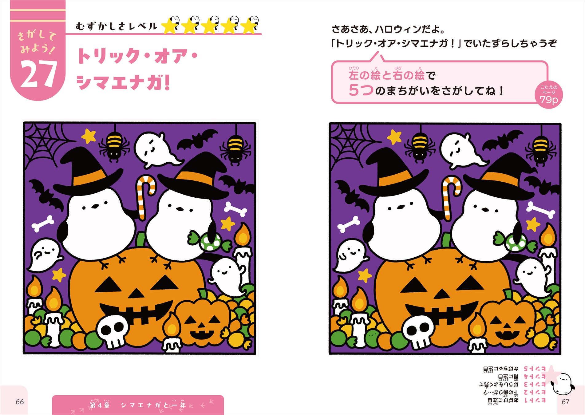 本書には初級・中級・上級の3段階で、たっぷり全28問のまちがいさがし問題を収録しています。さらにカバーの表と裏の絵にもまちがいが隠れています。
