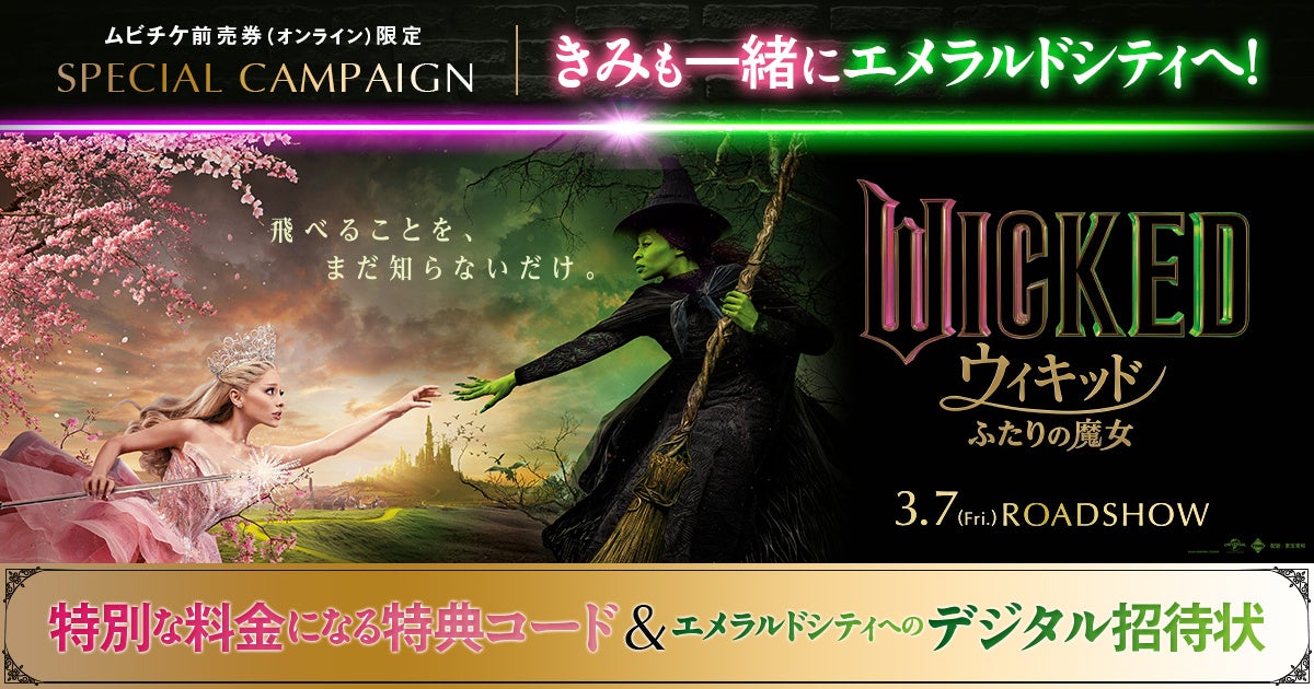株式会社ムービーウォーカー(本社:東京都千代田区、代表取締役社長:五十嵐淳之)は、オトクな特典コードとデジタル招待状がもらえる映画『ウィキッド ふたりの魔女』のムビチケ前売券(オンライン)購入者限定キャンペーンを開始しました。
