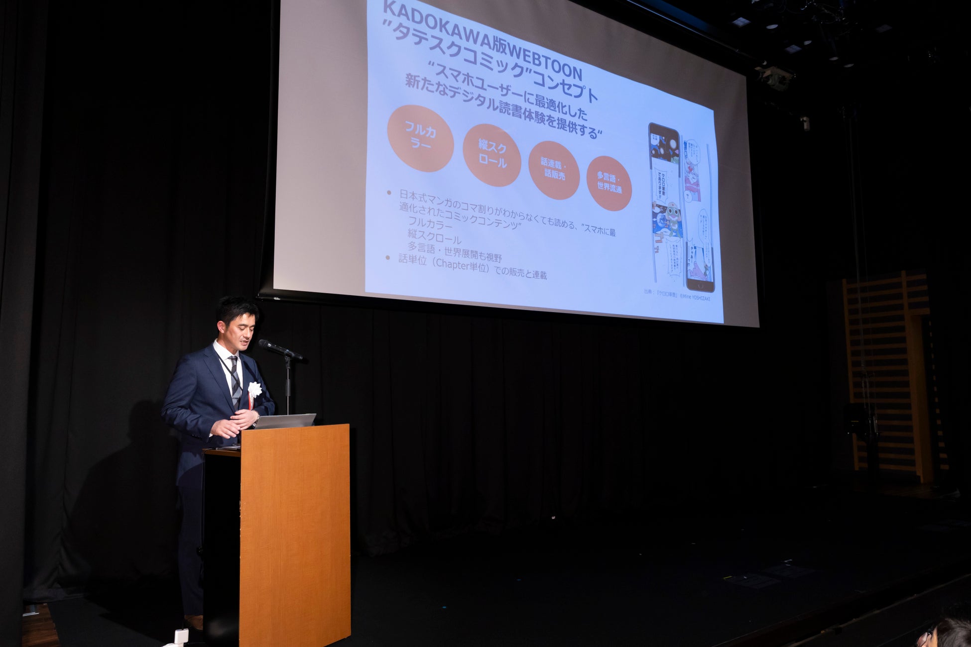 式の終わりには、KADOKAWAタテスクコミック部の寺谷圭生部長より事業の取り組みが紹介されました。