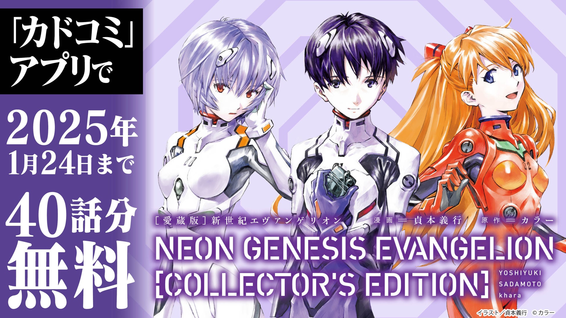 KADOKAWAの漫画サービス「カドコミアプリ」にて、「【愛蔵版】新世紀エヴァンゲリオン」1~3巻(40話分)を2025年1月24日(金)までの期間限定で、無料でお楽しみいただけます。