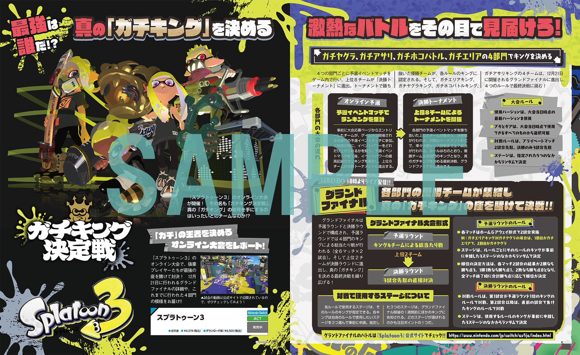 巻頭特集では、これまでに行われた"ガチヤグラ"、"ガチアサリ"、"ガチホコバトル"、"ガチエリア"各部門の決勝トーナメントのレポートと、2024年12月21日18時よりライブ配信される本大会の最終決戦「グランドファイナル」のレギュレーションの詳細をまとめています。