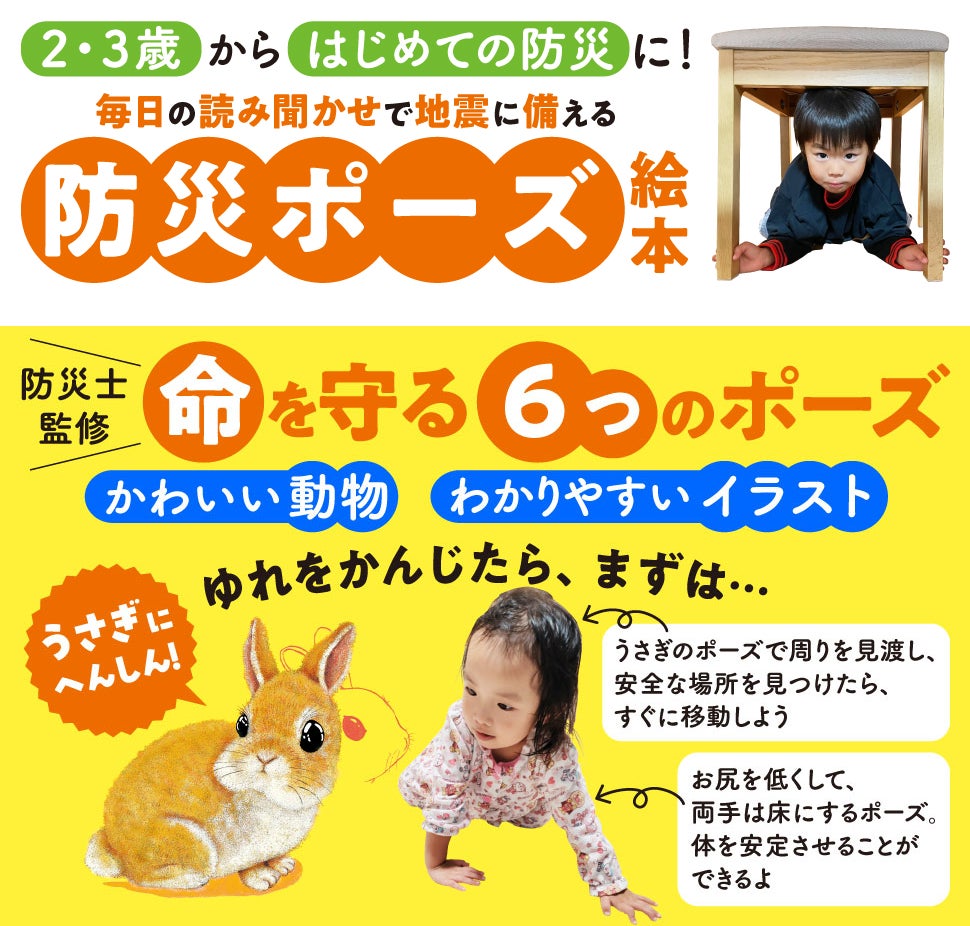 本作は、地震発生時に命を守る6つの「防災ポーズ」を身につけられる絵本。