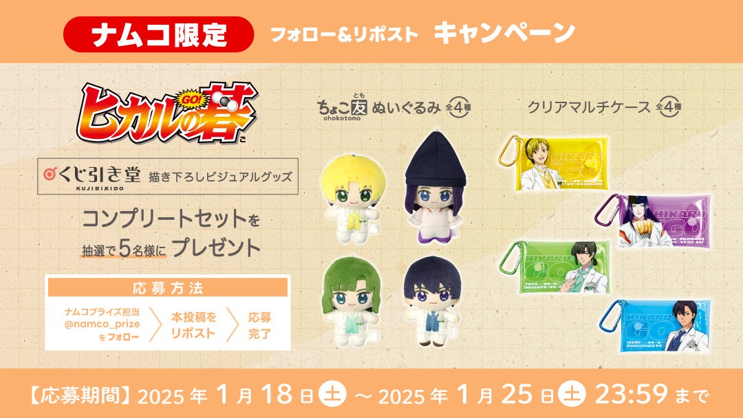期間中に対象の投稿をリポストした方の中から抽選で5名様に「ヒカルの碁 ちょこ友ぬいぐるみ4種&クリアマルチケース4種コンプリートセット」をプレゼント! 詳細はnamcoプライズ事務局X (@namco_prize)をご確認ください。