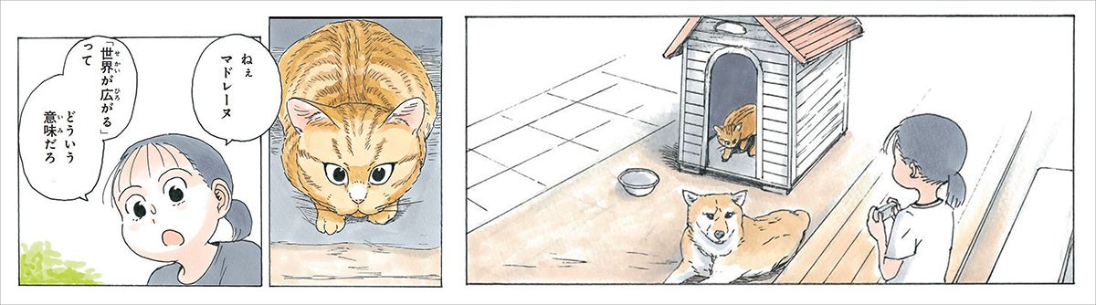 かのこちゃんは小学1年生の女の子。玄三郎はかのこちゃんの家の年老いた柴犬。マドレーヌ夫人は外国語を話せるアカトラの猫。ゲリラ豪雨が襲ったある日、玄三郎の犬小屋にマドレーヌ夫人が逃げこんできて……。