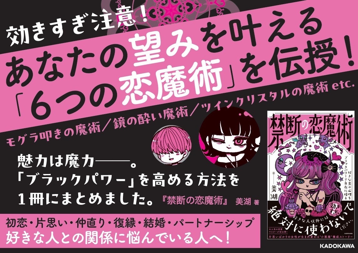 株式会社KADOKAWA(本社:東京都千代田区、取締役 代表執行役社長 CEO:夏野剛)は、SNS総フォロワー数20万人超のインフルエンサー・美湖さんによる新刊『禁断の恋魔術 好きな男の心理をブラックパワーで自在に操る』を2024年12月19日(木)に発売しました。