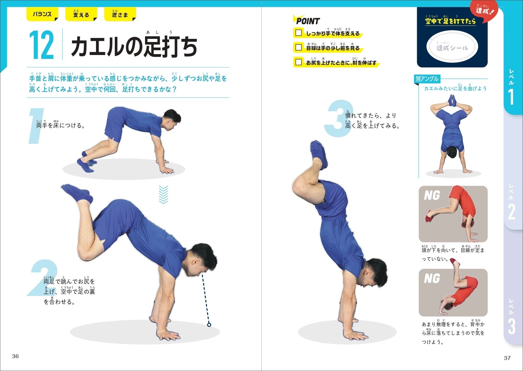 子どもが「できた!」を実感できる“達成シール”つき。特別編の「すごわざ」(ハンドスプリングなど)も紹介。