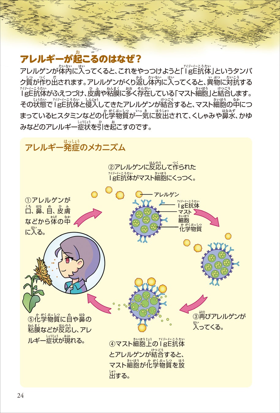 各章のまんがの間には、さらに知識が深まる記事ページを収録しています。アレルギーの種類や発症のメカニズム、アナフィラキシーの対処法、花粉症の予防方法など、生きていくうえで役立つ一生モノの基礎知識が身につきます。