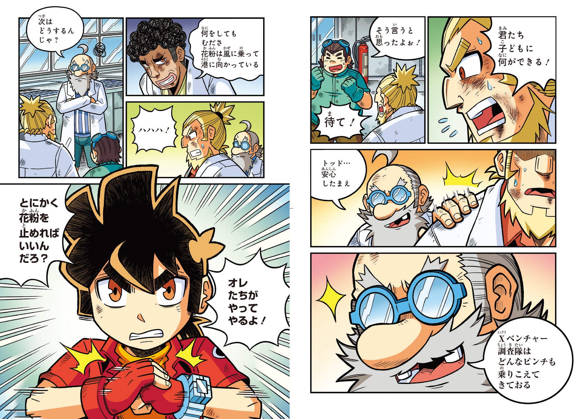 世界各地の問題を解決するXベンチャー調査隊のレインは、メンバーとともに離島の農業研究所にやって来た。そこでは、食料危機を救うために新種のスイカを開発していたが、その新種の花粉は、人体に強いアレルギー症状を引き起こすものだった。この花粉に目をつけたテロリストが花粉を空に解き放った! レインたちは危険な花粉との戦いを突破できるのか!? アレルギーや花粉症の知識も深まる、ハラハラドキドキのアクション科学まんが!!