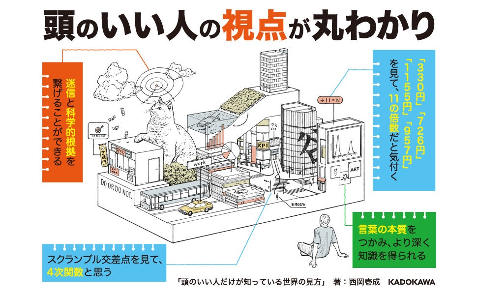 株式会社KADOKAWA(本社:東京都千代田区、取締役 代表執行役社長 CEO:夏野剛)は、2025年1月15日(水)に、著書累計90万部超の東大生ベストセラー作家・西岡壱誠による新刊『頭のいい人だけが知っている世界の見方』を刊行します。本書は、頭のいい人々の思考法や世界の捉え方を具体的に紐解き、読者自身が日常の中で賢くなる視点と習慣を手に入れることを目指した一冊です。