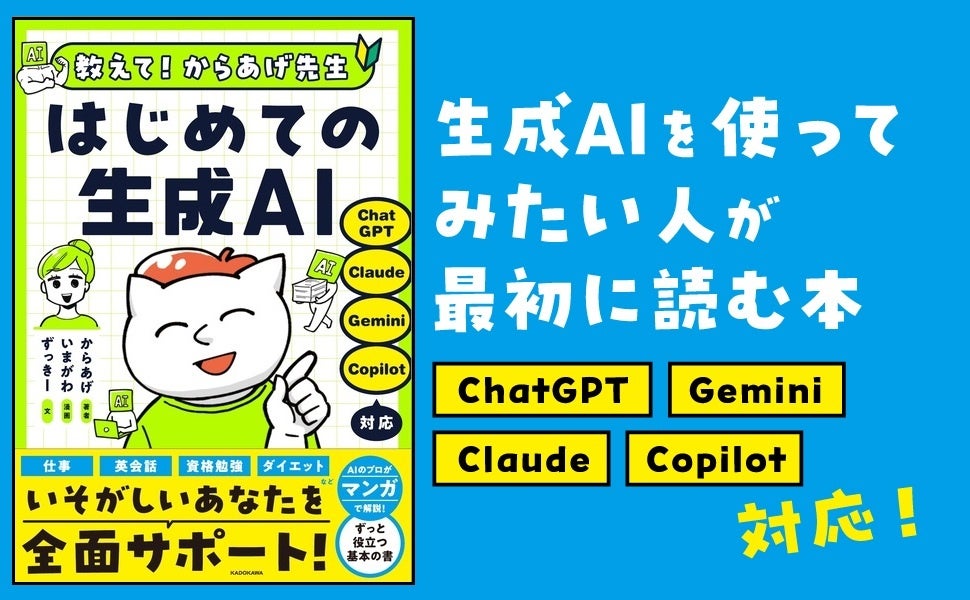 株式会社KADOKAWA(取締役 代表執行役社長 CEO:夏野剛、本社:東京都千代田区、以下KADOKAWA)は、2025年1月22日(水)に『教えて!からあげ先生 はじめての生成AI』(著:からあげ、漫画:いまがわ、文:ずっきー)を発売いたします。