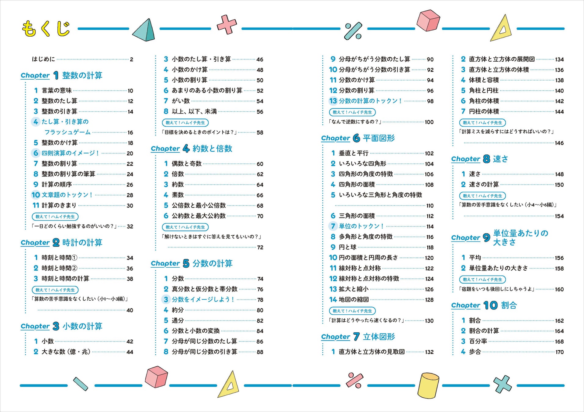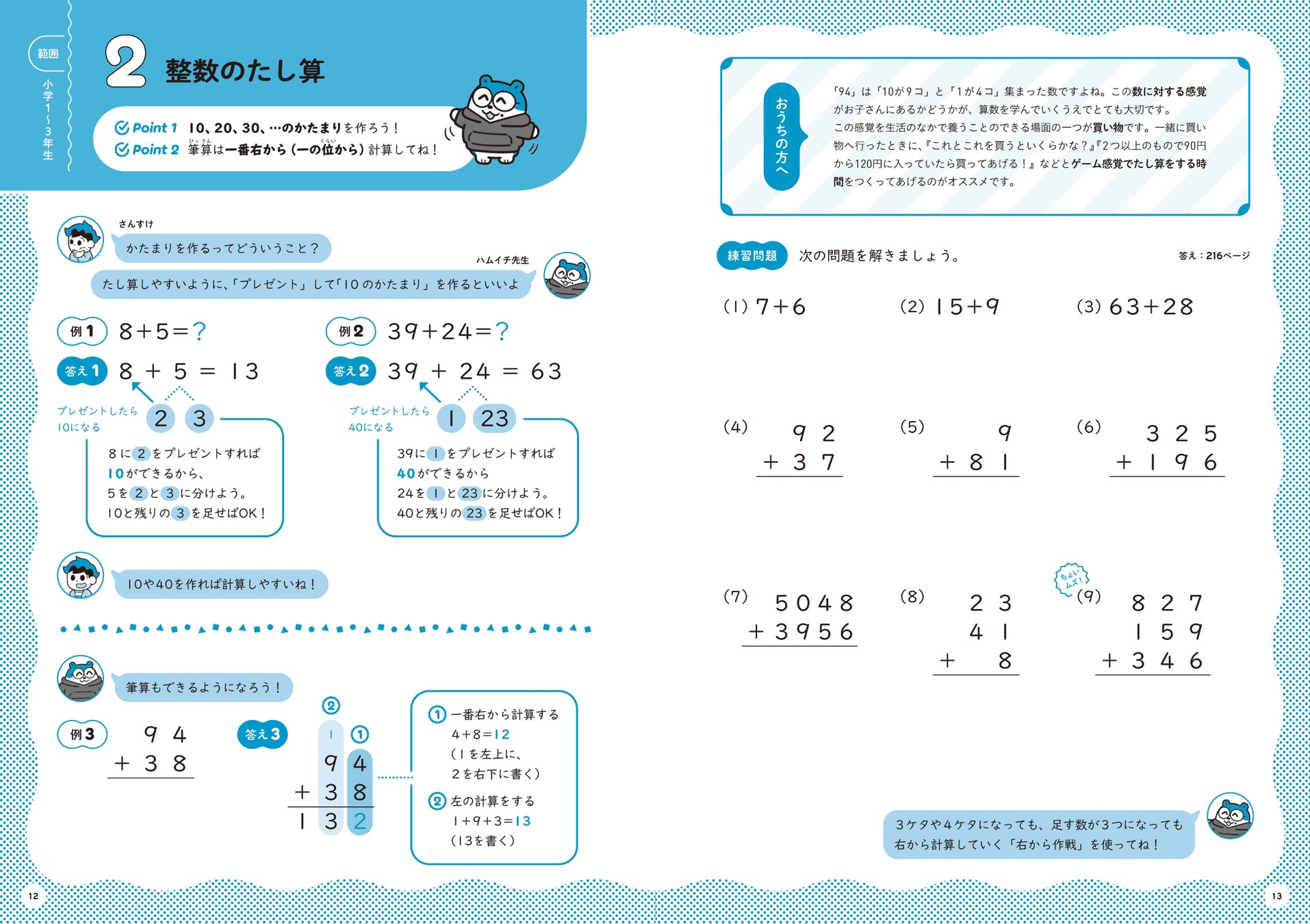苦手な子どもが多い「筆算のくり上がり・くり下がり」「時計」「割合」「速さ」「並べ方・組み合わせ」など、著者ならではの「解き方のコツ」が満載です。