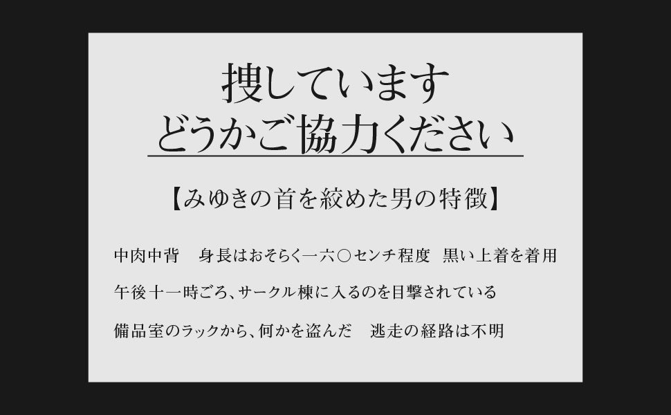 舞台は著者の出身地でもある九州地方。とある大学の学生たちによって語られた怪談のなかに頻繁に登場する「みゆき」という名前と、彼女にまつわる事件と噂。一見にバラバラにみえる情報をひとつの物語として繋ぐ数々の資料と考察が、モキュメンタリーホラーの新境地へと導きます。じわじわと侵食するような不気味さと、得体のしれない恐怖が押し寄せる読書体験をぜひお楽しみください。