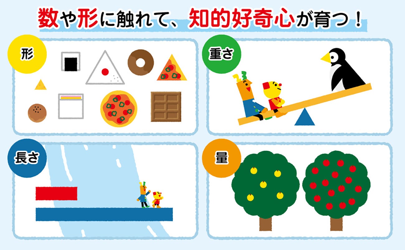 数、形、色、長さ、重さ、量、仲間分けなど、算数の基本となるトピックがこの1冊に詰まっています。