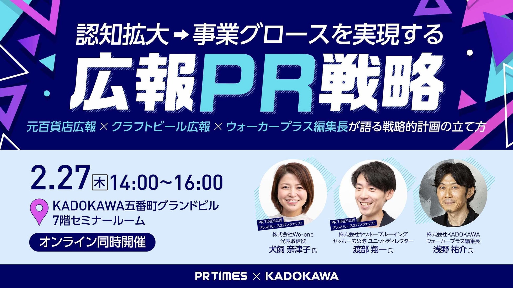 KADOKAWA×PR TIMES共催にて、講師の犬飼奈津子さん、ヤッホーブルーイング広報PR担当の渡部翔一さん、KADOKAWA『ウォーカープラス』編集長の浅野祐介による、PRパーソン・メーカー・メディアそれぞれの目線で広報PRの秘訣を伝えるクロストーク形式の無料セミナーを開催いたします。