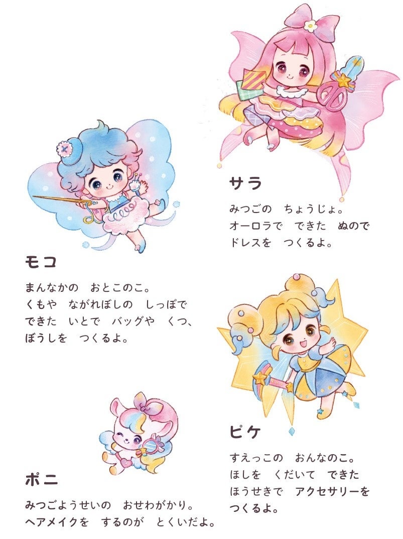 みつごたちがオーロラ・雲・星の魔法で作ったおしゃれなドレスやアイテムで、友達の誕生日会でおしゃれをしたい子や、おしゃれで自信をつけて誰とでも話せる勇気がほしい子の願いを叶えます。