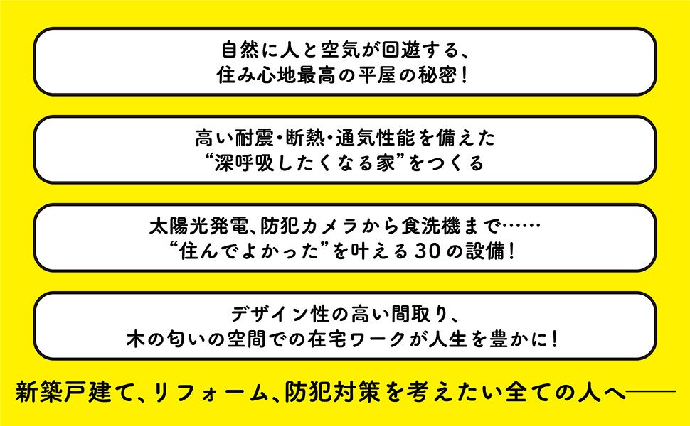 前著『住まい大全』で紹介した家づくり・家探しの手順もまじえながら、読者の皆様が家族と長期的に快適な暮らしを手に入れるための方法を余すことなく提案しています。