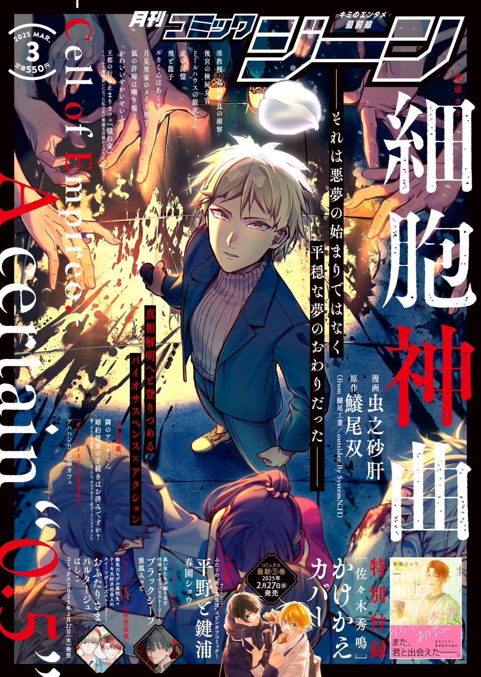 月刊コミックジーン3月号が好評発売中! 表紙は『平野と鍵浦』、裏表紙には新連載の『細胞神曲 -Cell of Empireo.- A certain "0.5"』が登場!