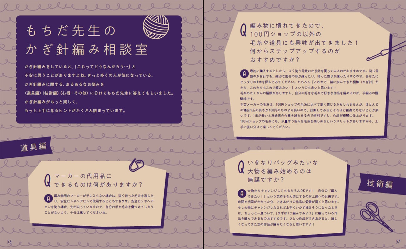 かぎ針編みあるあるな疑問や不安にお答えする、「もちだ先生のかぎ針編み相談室」も。