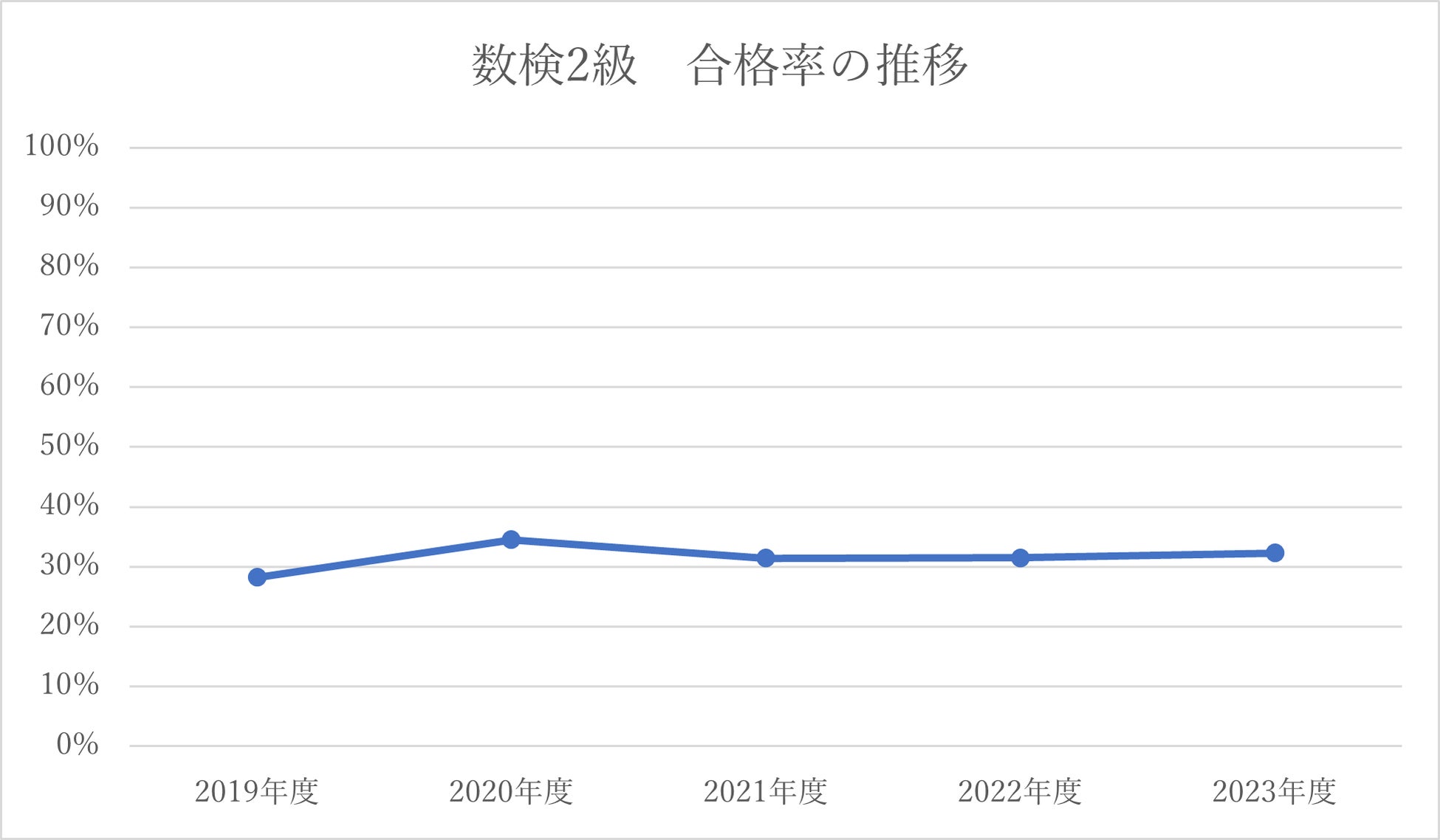 公益財団法人 日本数学検定協会(本部:東京都台東区、理事長:髙田忍)の発表によると、実用数学技能検定「数検」2級(以下、数学検定2級)の合格率は次のように推移しています。