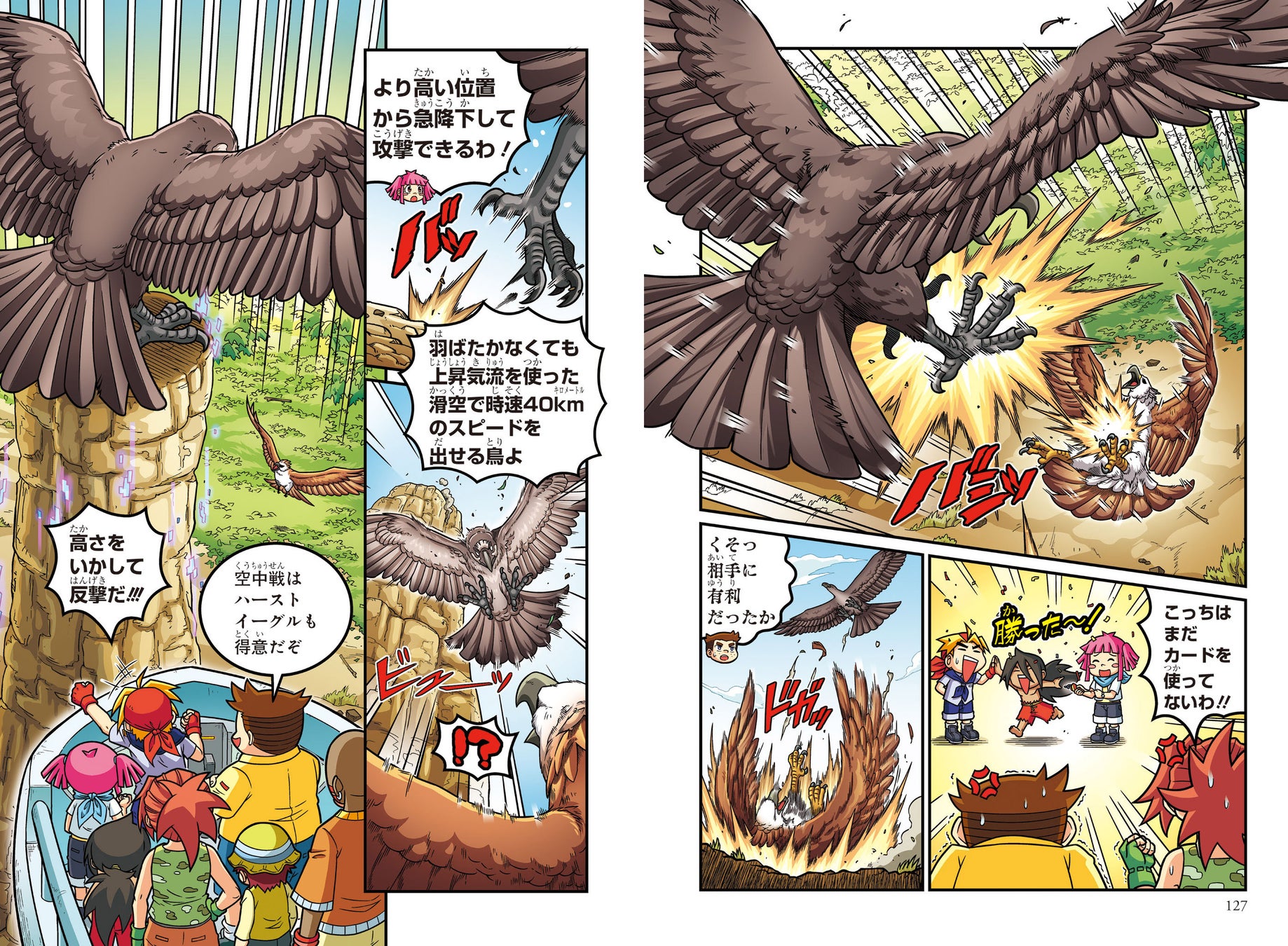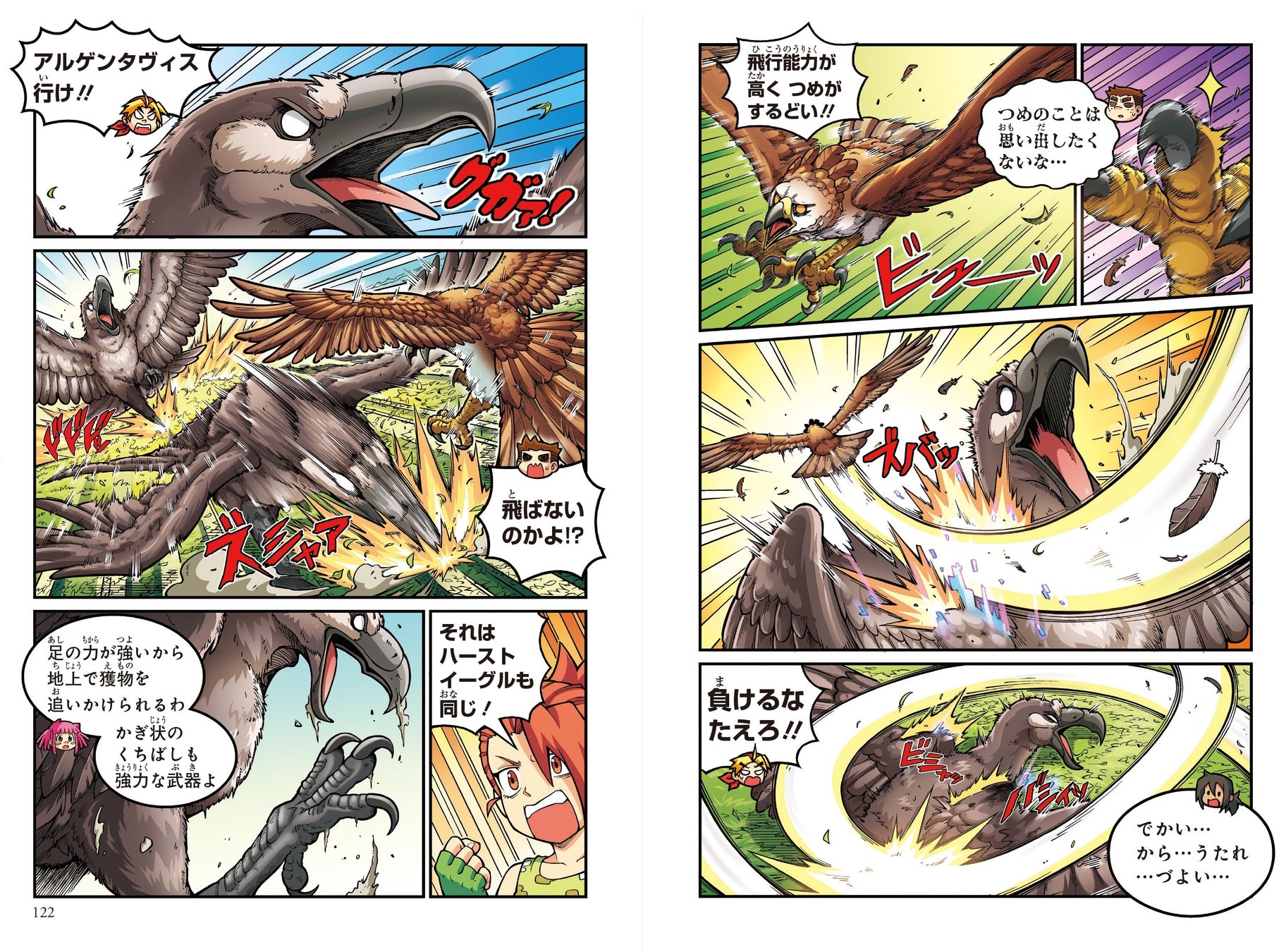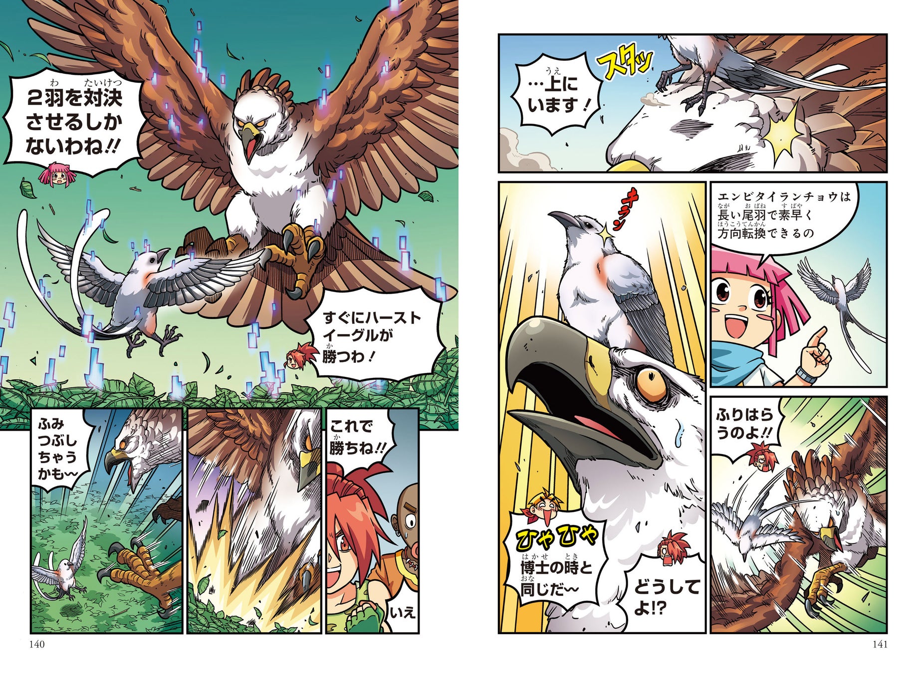 まんがの中では、動物の保護や環境についても学べます。それだけではなく「高い所からの攻撃はなぜ強い?」「スピードとの関係は?」など、科学への興味がグッと広がる内容がたっぷり!