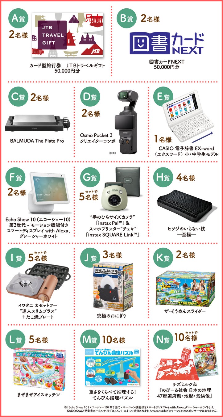 株式会社KADOKAWA(本社:東京都千代田区、取締役 代表執行役社長 CEO:夏野剛)は、児童書サイト「ヨメルバ」にて、サイト開設5周年を記念し、「カード型旅行券 JTBトラベルギフト」や「図書カードNEXT」5万円分、「BALMUDA The Plate Pro」など豪華賞品が当たるキャンペーンを2025年2月28日(金)より開始しました。