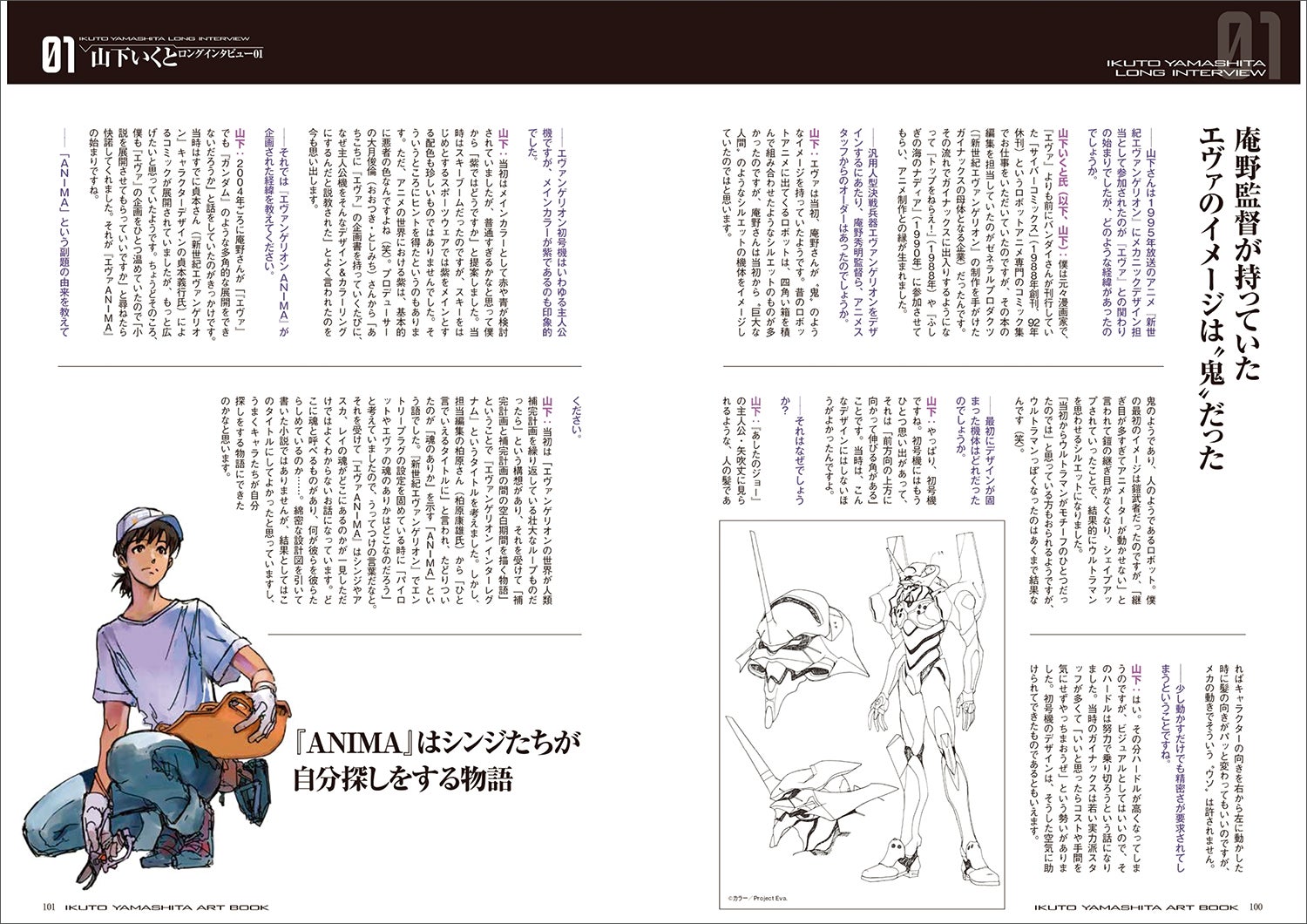 『エヴァンゲリオンANIMA 山下いくと画集』では、160ページを埋め尽くしたイラストについての話はもちろん、山下いくとが改めて『エヴァンゲリオン』のデザインや、『ANIMA』への思いを語った、ファン必読のロングインタビューをたっぷり収録しています。