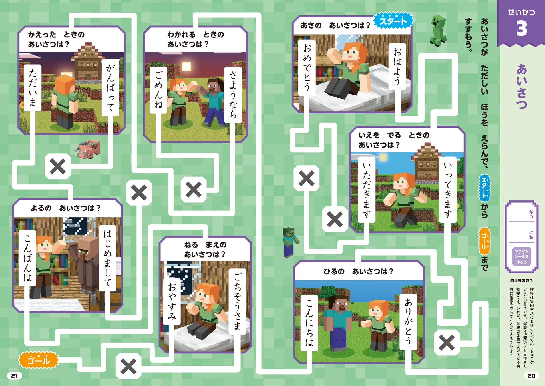 「こくご」「さんすう」「せいかつ」の3科目でバランスよく構成し、無理なく小学校入学準備をサポートします。マインクラフトの世界観で学習できるから飽きずに最後まで取り組むことができるのはもちろん、小学校入学までにおさえておきたい学習内容や学校生活でのマナーなどを、自然と身につけられる1冊です。