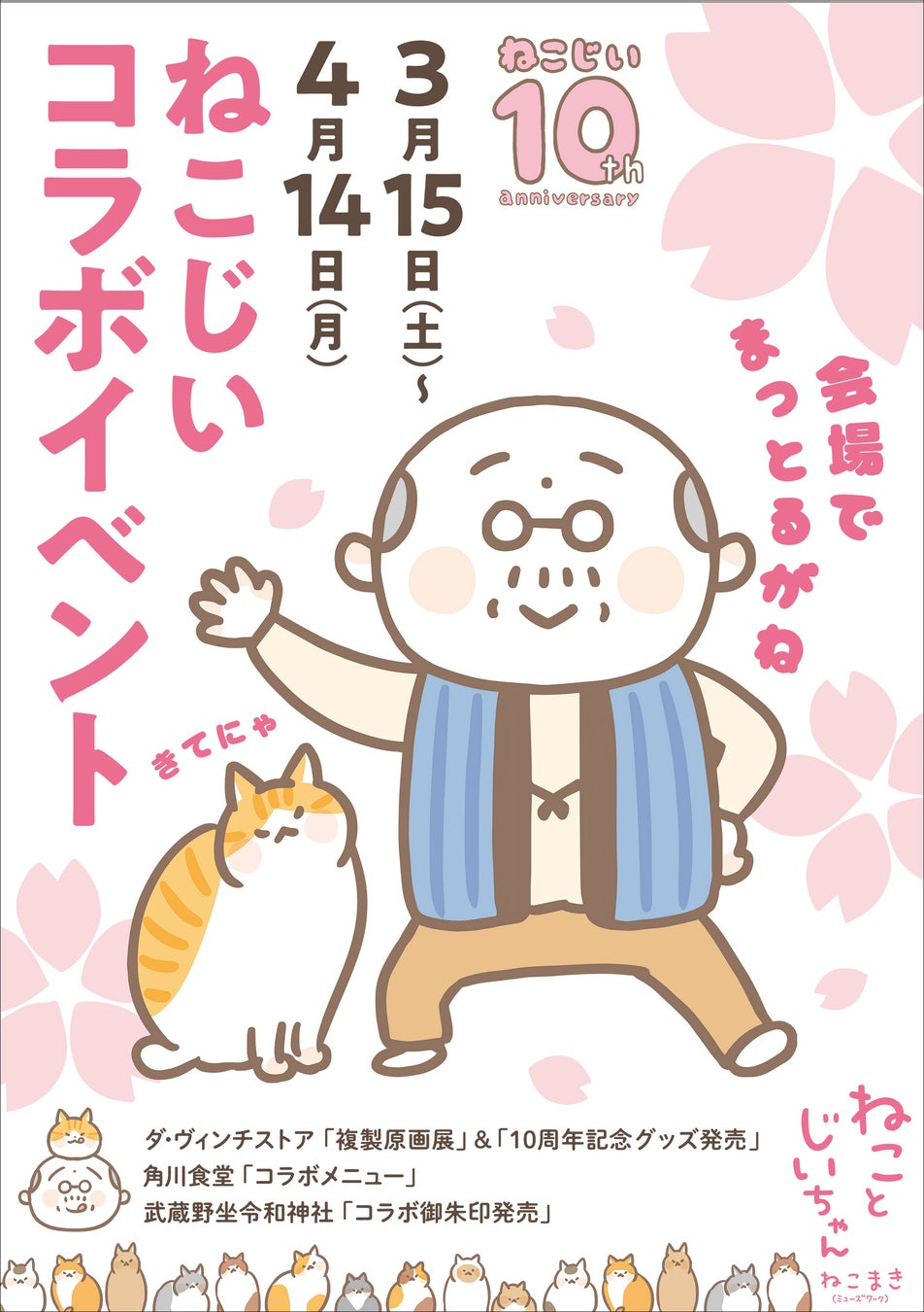 『ねことじいちゃん』は、この度1巻刊行から10周年を迎えます。そこで、10周年を記念してところざわサクラタウン内の角川食堂(3階)、ダ・ヴィンチストア(2階)、武蔵野坐令和神社にて、2025年3月15日(土)から2025年4月14日(月)に特別イベントを開催します。