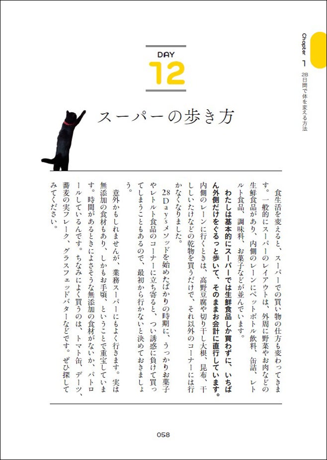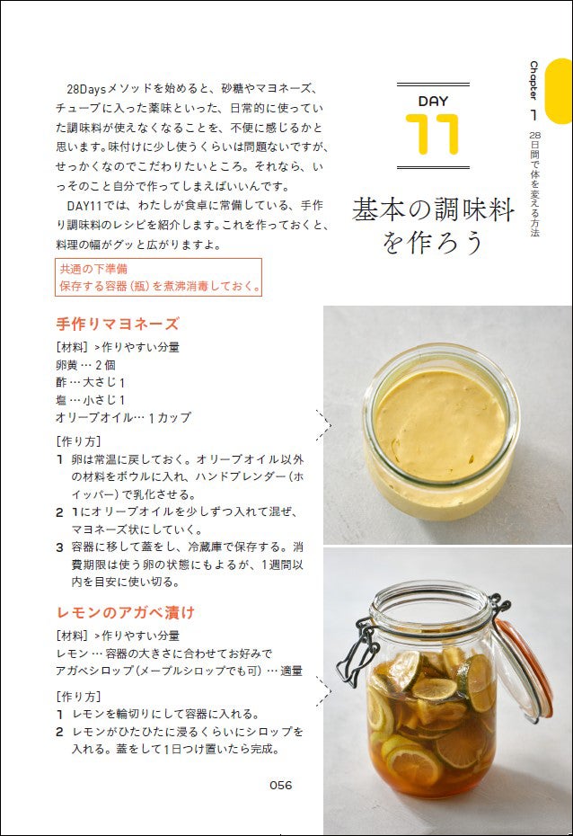 本書のChapter1では、DAY1からDAY28まで、食養生に必要な知識や実践してほしいこと、そして役に立つレシピを毎日少しずつ学べるように紹介しています。ちゃおさんのメソッドは、普段の食事に何かをプラスする「足し算」ではなく、いわば「引き算」。糖や小麦製品など、食べないほうがいいものを極力控えるようにすることをベースに、量はしっかり食べていくので、辛い食事制限などはありません。また、パンのかわりの高野豆腐もどきパンや、無添加の乳酸菌飲料のリジュベラックなど、つい作りたくなるヘルシーレシピが満載です。