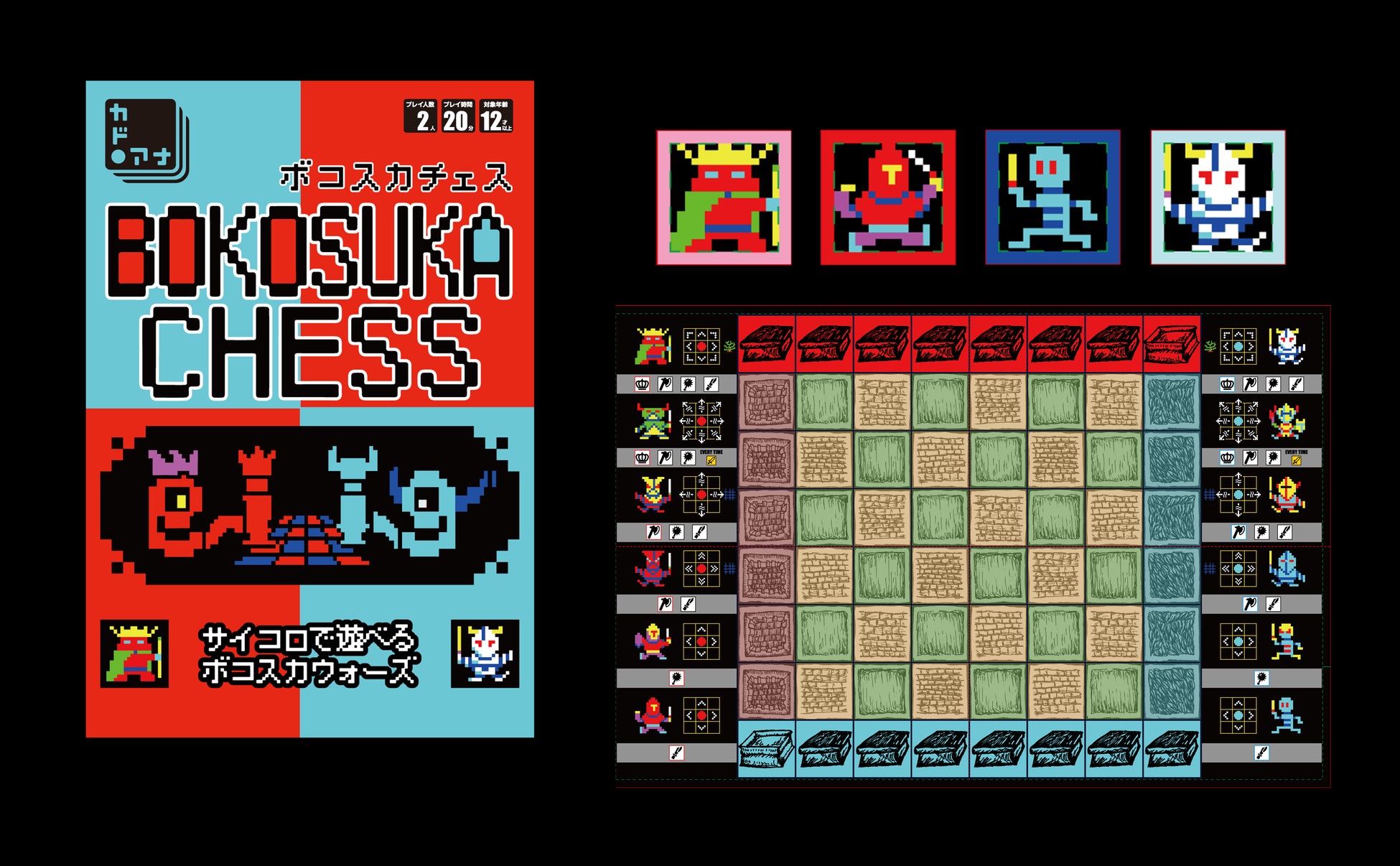 みなさん! ボコスカウォーズをゲーム機を使わずに遊べるシステムが完成しました! なくなっていくゲーム機を気にせずボコスカの醍醐味を未来永劫楽しめます。そして、マスに進めば絶対相手の駒を倒せるなんてなまやさしい普通のチェスに帰ることはもうできません。勝つか負けるかサイコロ勝負! 新しいチェスを体験して下さい!