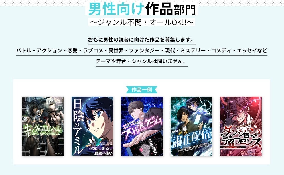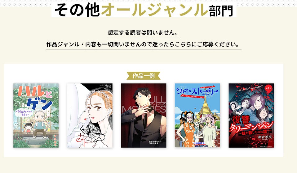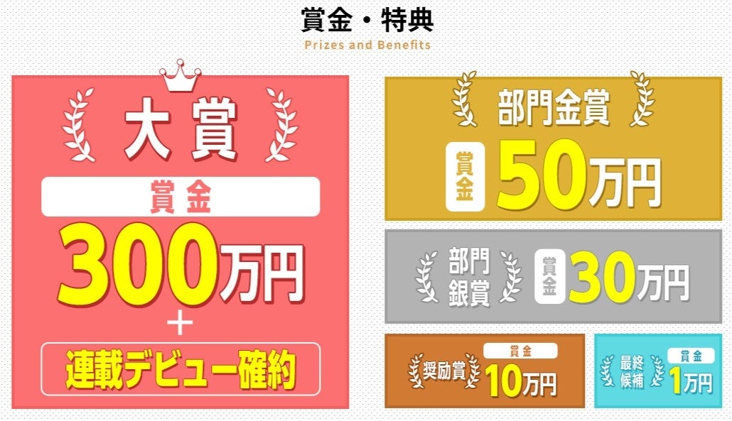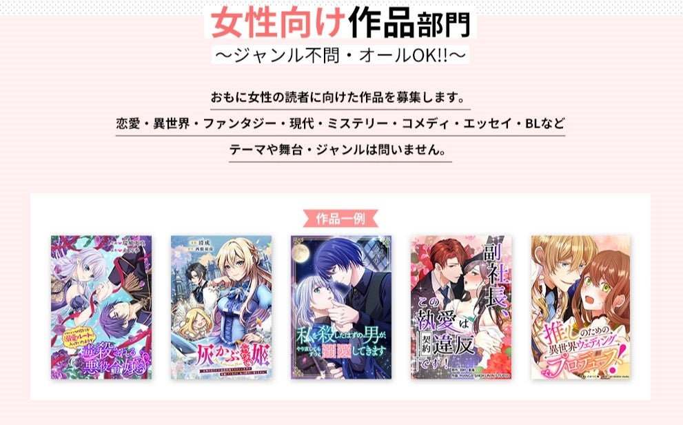 「女性向け作品部門」「男性向け作品部門」「その他オールジャンル部門」と、応募しやすさを重視した3部門からご自由にお選びいただけます!