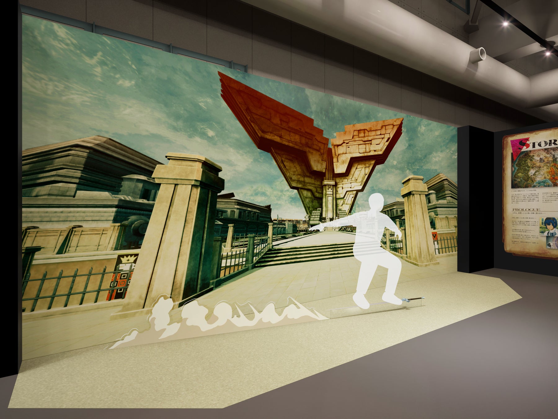印象的なメインメニューを再現した展示や、開発コメントとともに楽しめる映像コンテンツを通して、