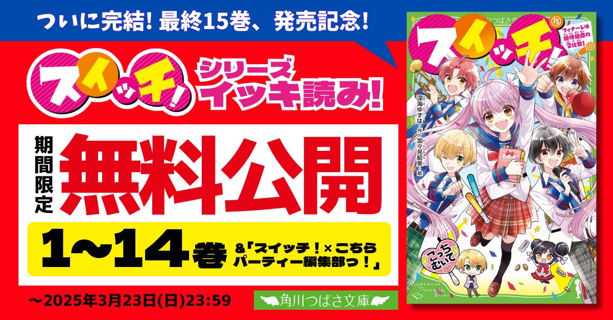 株式会社KADOKAWA(本社:東京都千代田区、取締役 代表執行役社長 CEO:夏野 剛)は、角川つばさ文庫より、大ヒット学園ラブコメシリーズ最新作『スイッチ!⑮ フィナーレは絶体絶命の文化祭!』を2025年3月12日(水)に発売いたします。あわせて「スイッチ!」シリーズ関連本の【計15冊一挙無料公開】を、期間限定で実施します。