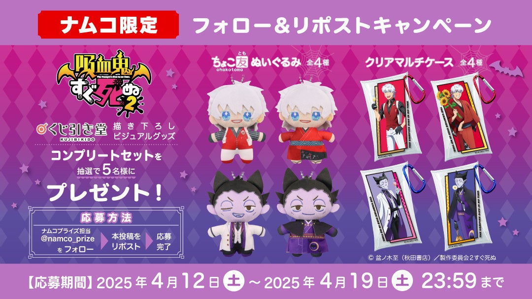期間中に対象の投稿をリポストした方の中から抽選で5名様に「吸血鬼すぐ死ぬ2 ちょこ友4種&クリアマルチケース4種コンプリートセット」をプレゼント!詳細はnamcoプライズ担当X (@namco_prize)をご確認ください。