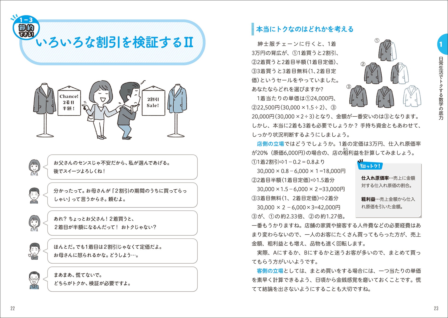 「どちらがトク(安い)でしょう?」といった身近なものから、税金や貯蓄法、時短できる計算法などのトクになる情報、金銭詐欺やリボ払いなどで思わぬソンをしないようにするための知識、さらには「これも数学?」と思えるようなテーマまで。中学の数学が苦手だった、勉強全般嫌いだった、という人でも、本書を読めば「へぇ、そういうことだったんだ」と感じられるはずです。主人公・アンナさんとその家族のふとした会話を入り口に、図やイラスト満載で西口正氏(グッチ先生)が解説してくれます。少々の「昭和おやじギャグ」をご勘弁いただければ、家族で、幅広い年代で楽しく読んでいただける一冊となっています。もしかしたら、「私って数学好きかも?」と思えるかもしれません。