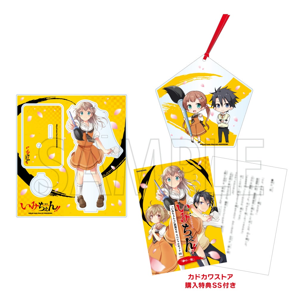 「『いみちぇん!!』アクリルペンスタンド 直毘モモ」と「『いみちぇん!』アクリルしおりキーホルダー」がセットに! さらに、本編では描かれなかった「いみちぇん!! ふたたび、ひみつの二人組」後のモモ&匠のエピソードが読める、あさばみゆき先生書き下ろしSS『砂の一粒』もついてくる!