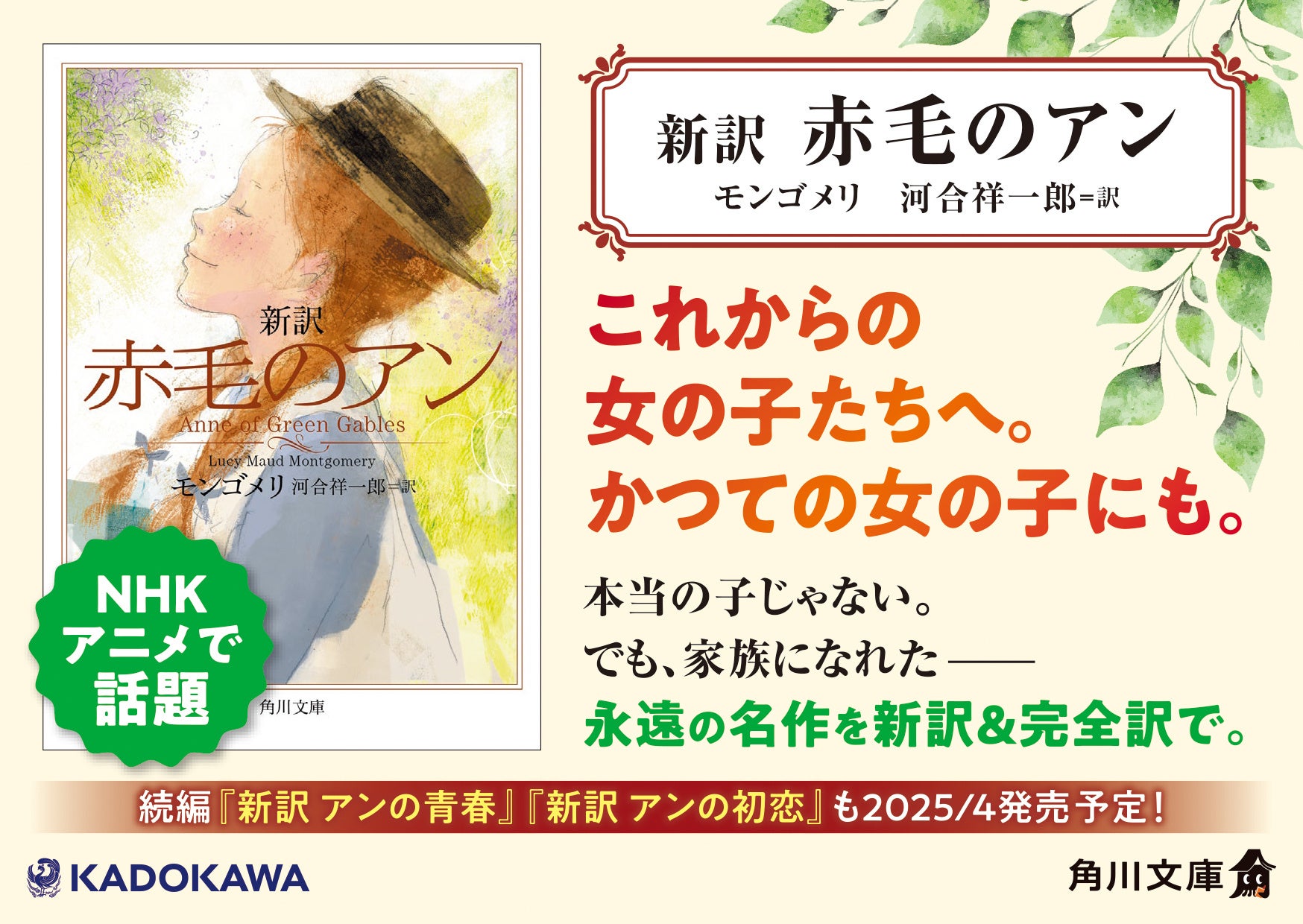 株式会社KADOKAWA(本社:東京都千代田区、 代表取締役社長:夏野剛)は、 2025年3月22日(土)に、『新訳 赤毛のアン』(モンゴメリ 河合祥一郎=訳 角川文庫)を発売します。