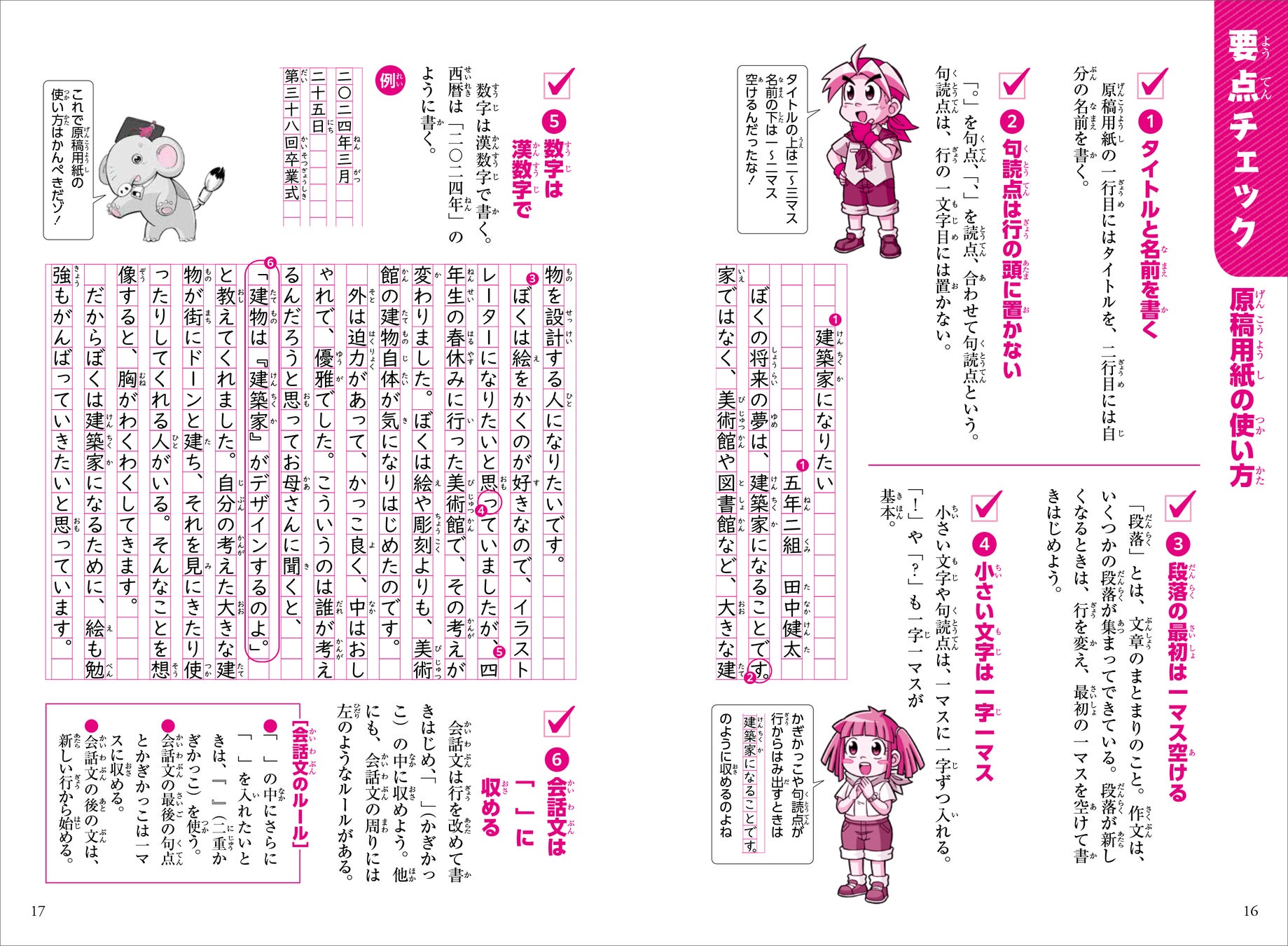 「要点チェック」ではまんがで学んだ作文のポイントを例文とともにわかりやすくまとめているので、書き方に迷ったときの参考になります。