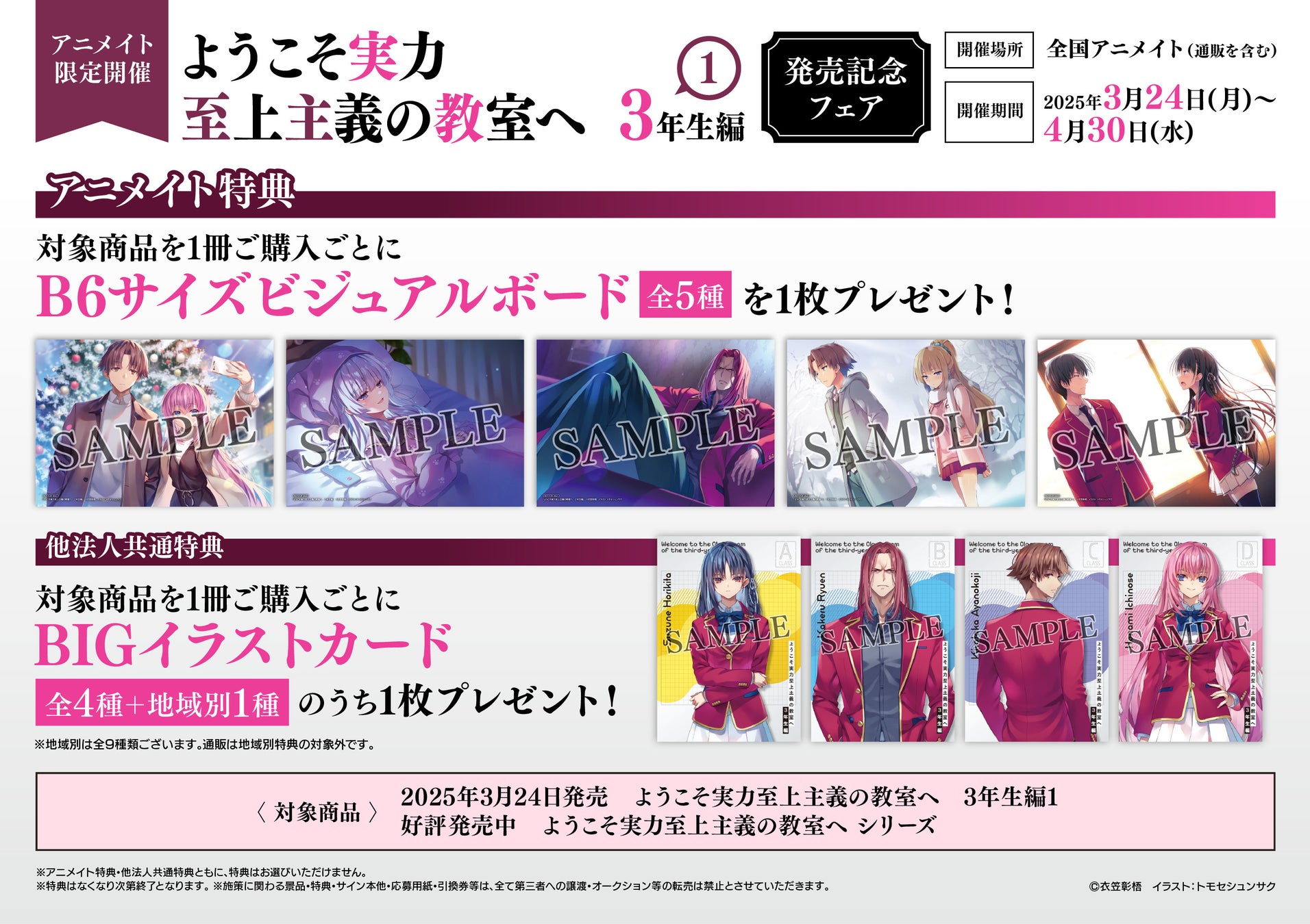 アニメイト全店(※通販含む)にて、「『ようこそ実力至上主義の教室へ3年生編1』発売記念フェア」開催決定!