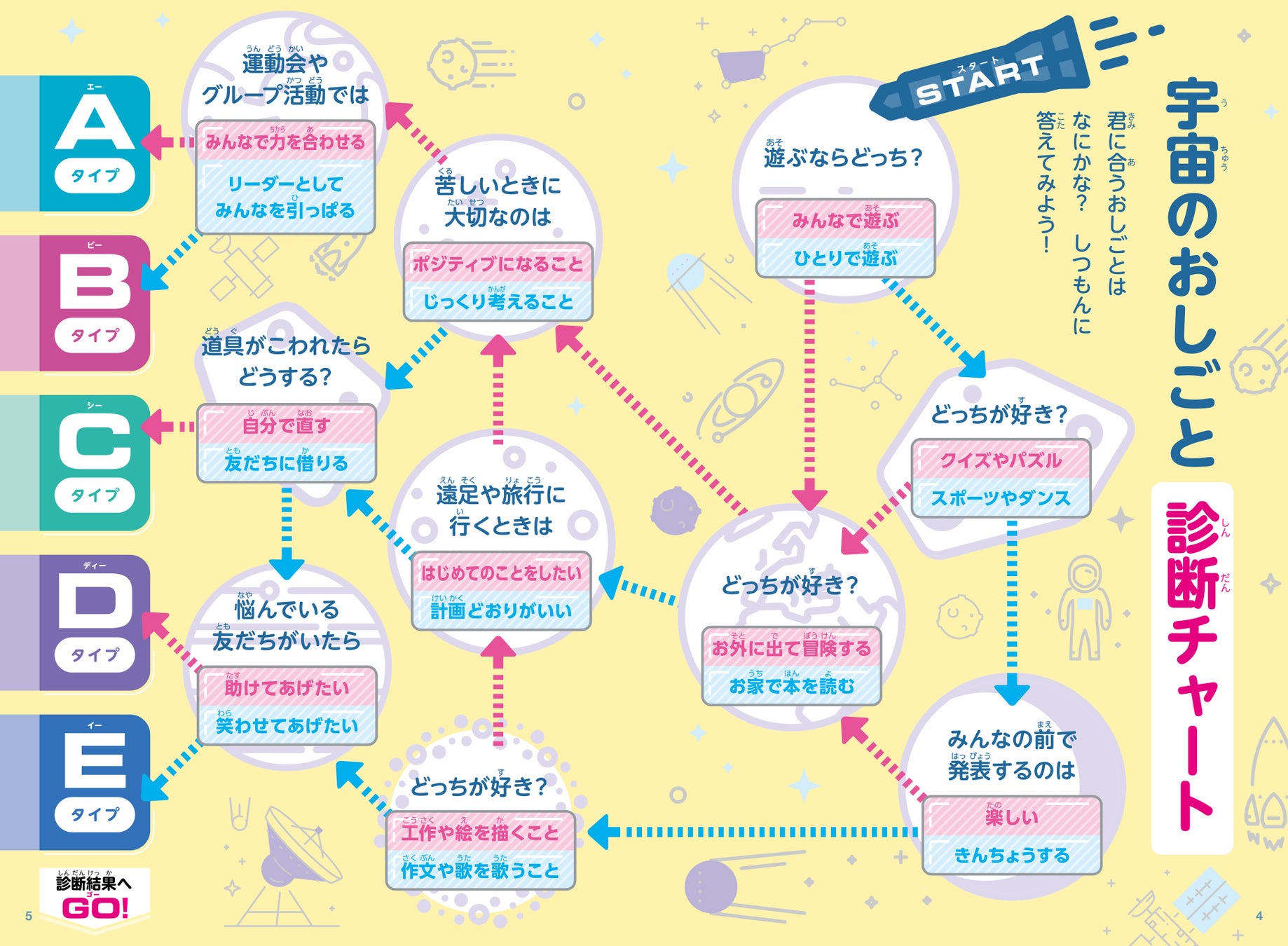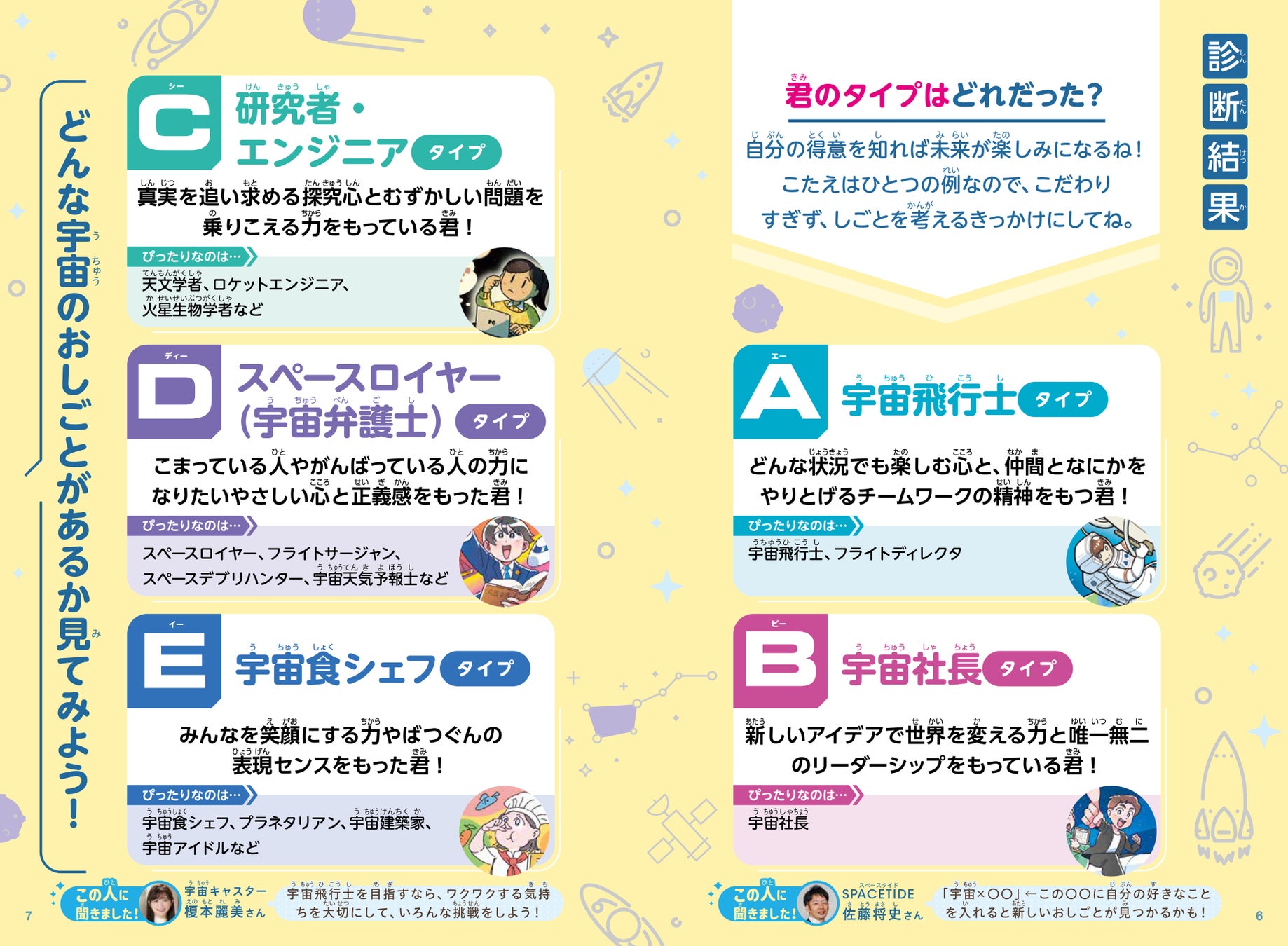 本書では、冒頭の「宇宙のおしごと診断チャート」で自分のおしごとタイプを考えたうえでさまざまな宇宙に関わるおしごとを知ったり、さらにそのおしごとに取り組む14人のインタビューや30人以上のコメントで生の声に触れられたりと、将来の選択肢を広げる学びのしかけが満載です。