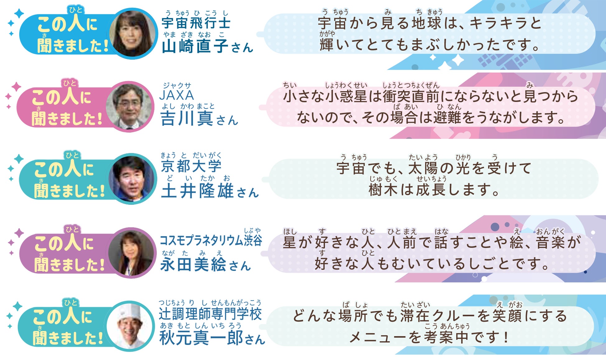 インタビューページでは、宇宙開発のルールをつくる「スペースロイヤー(宇宙弁護士)」の新谷美保子さん(TMI総合法律事務所弁護士)や、宇宙飛行士の山崎直子さん(日本宇宙少年団〔YAC〕理事長)、はやぶさ2プロジェクトマネージャーの津田雄一さん(JAXA宇宙科学研究所教授)など、世界中から注目される人たちが、どうやって今の仕事に就いたのか、これから宇宙はどうなっていくのかといった話のほか、宇宙に興味を持っている子どもたちへ向けたメッセージも語っています。