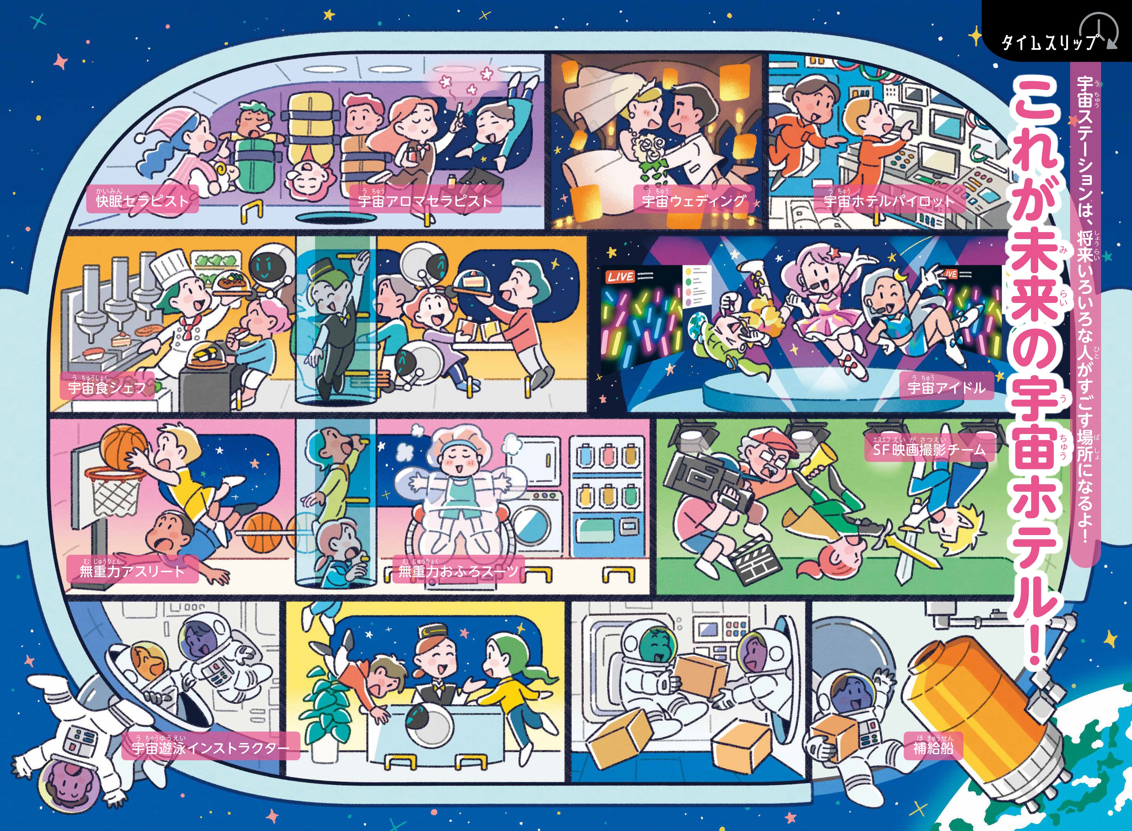 ▼多くの取材をもとに描かれた、将来月面や火星で活躍するおしごとが集合した未来予想図ページ