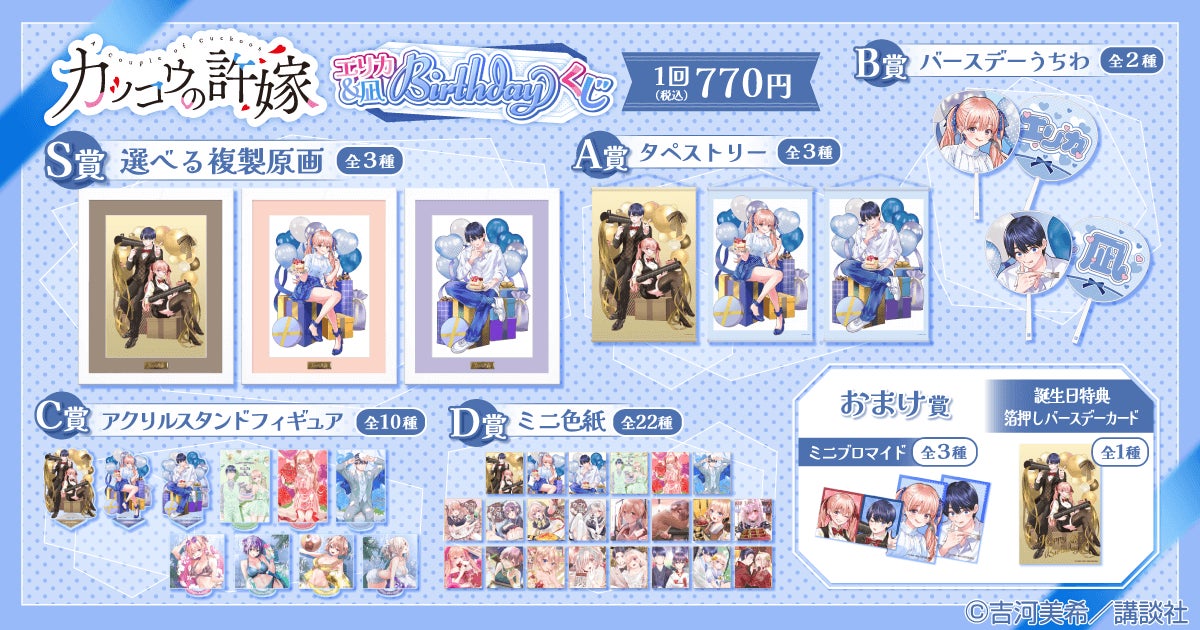 株式会社KADOKAWA(本社:東京都千代田区、取締役 代表執行役社長 CEO:夏野 剛、以下 KADOKAWA)は、運営するオンラインくじサービス「くじ引き堂」において、『カッコウの許嫁』の豪華賞品が手に入る<カッコウの許嫁 エリカ&凪 Birthdayくじ>を、2025年4月6日(日)12時より販売します。