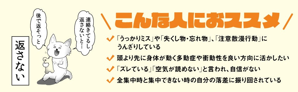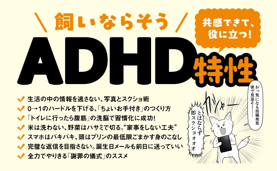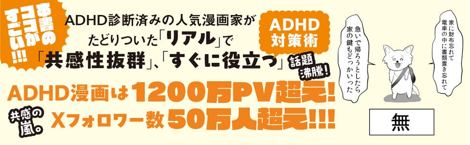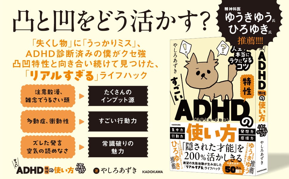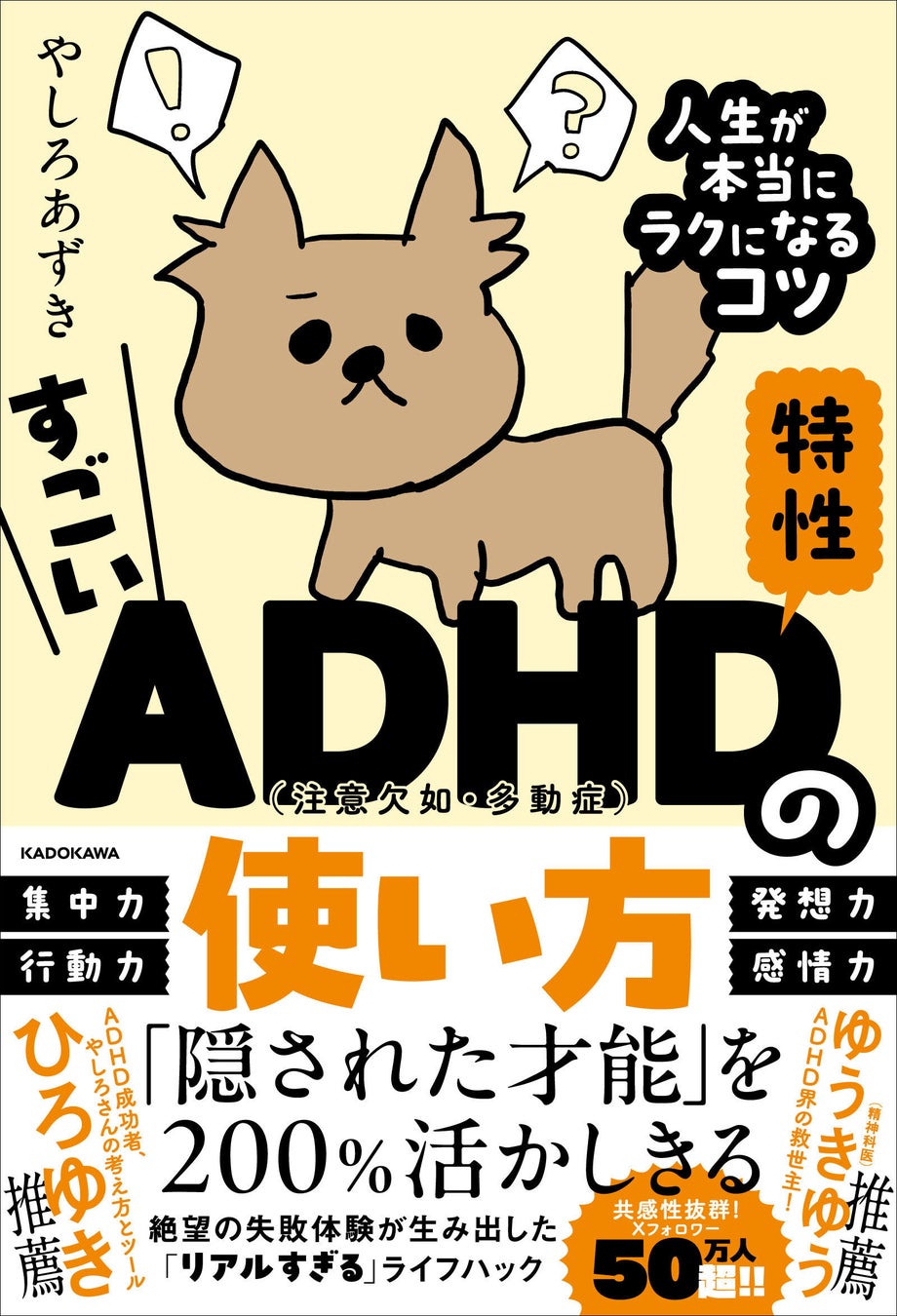 株式会社KADOKAWA(取締役 代表執行役社長 CEO:夏野剛、本社:東京都千代田区)は、やしろあずきの最新刊となる『すごいADHD特性の使い方 人生が本当にラクになるコツ』を2025年3月26日(水)に刊行しました。著者はXフォロワー数50万人超えの人気漫画家。XでPV数1200万超の話題を呼んだエピソードをはじめ、本書では、ADHDのプラスとマイナスそれぞれの特性を人生に活かすコツを豊富に紹介しています。