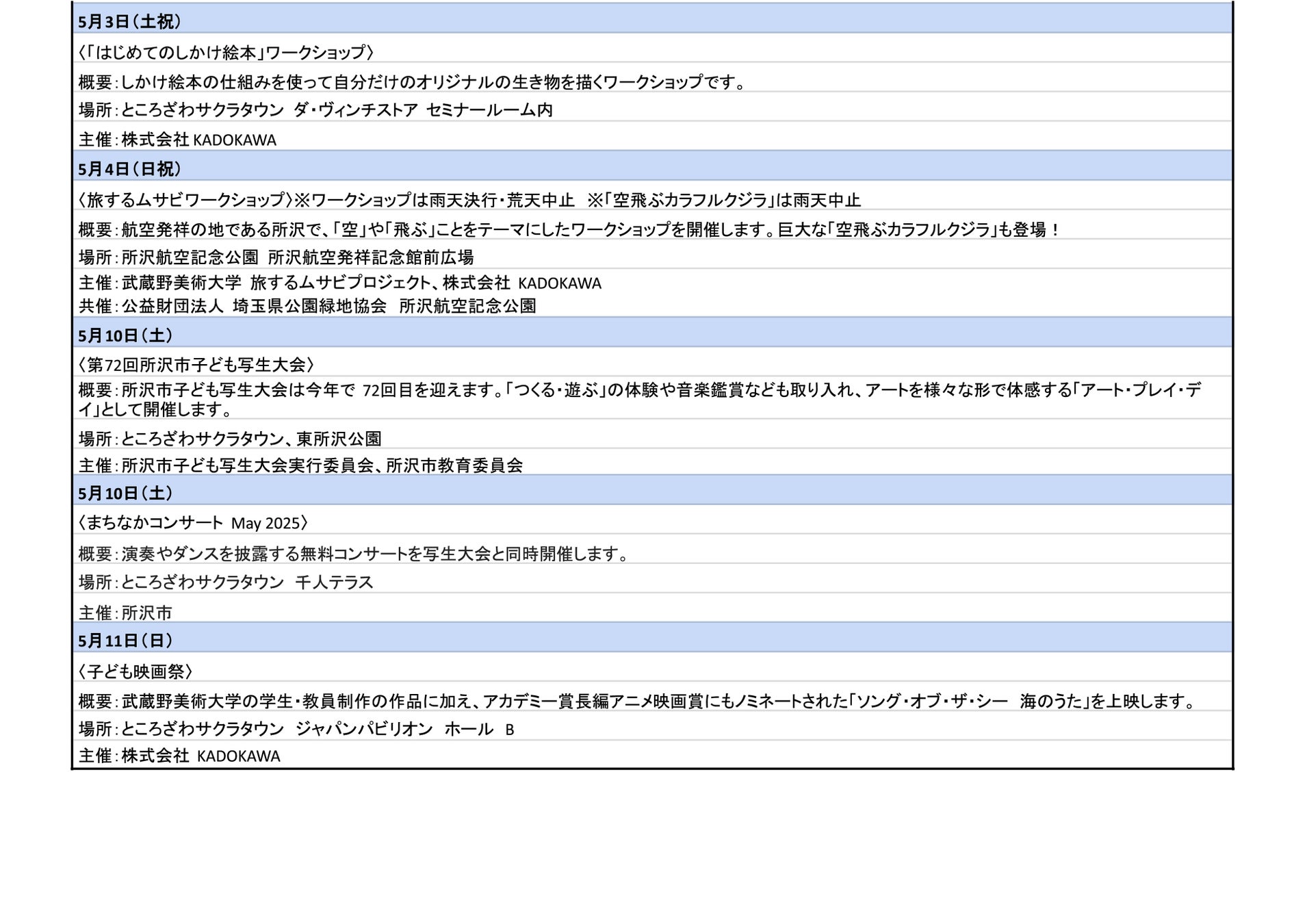 70年以上の歴史を誇る2025年5月10日(土)開催の「所沢市子ども写生大会」の時期に合わせ、西武鉄道所沢駅や所沢航空記念公園、グランエミオ所沢、エミテラス所沢、ところざわサクラタウンといった所沢市内の公共空間、商業施設等にて子どもたちがアートや地域文化に触れることのできる様々なイベントを実施します。