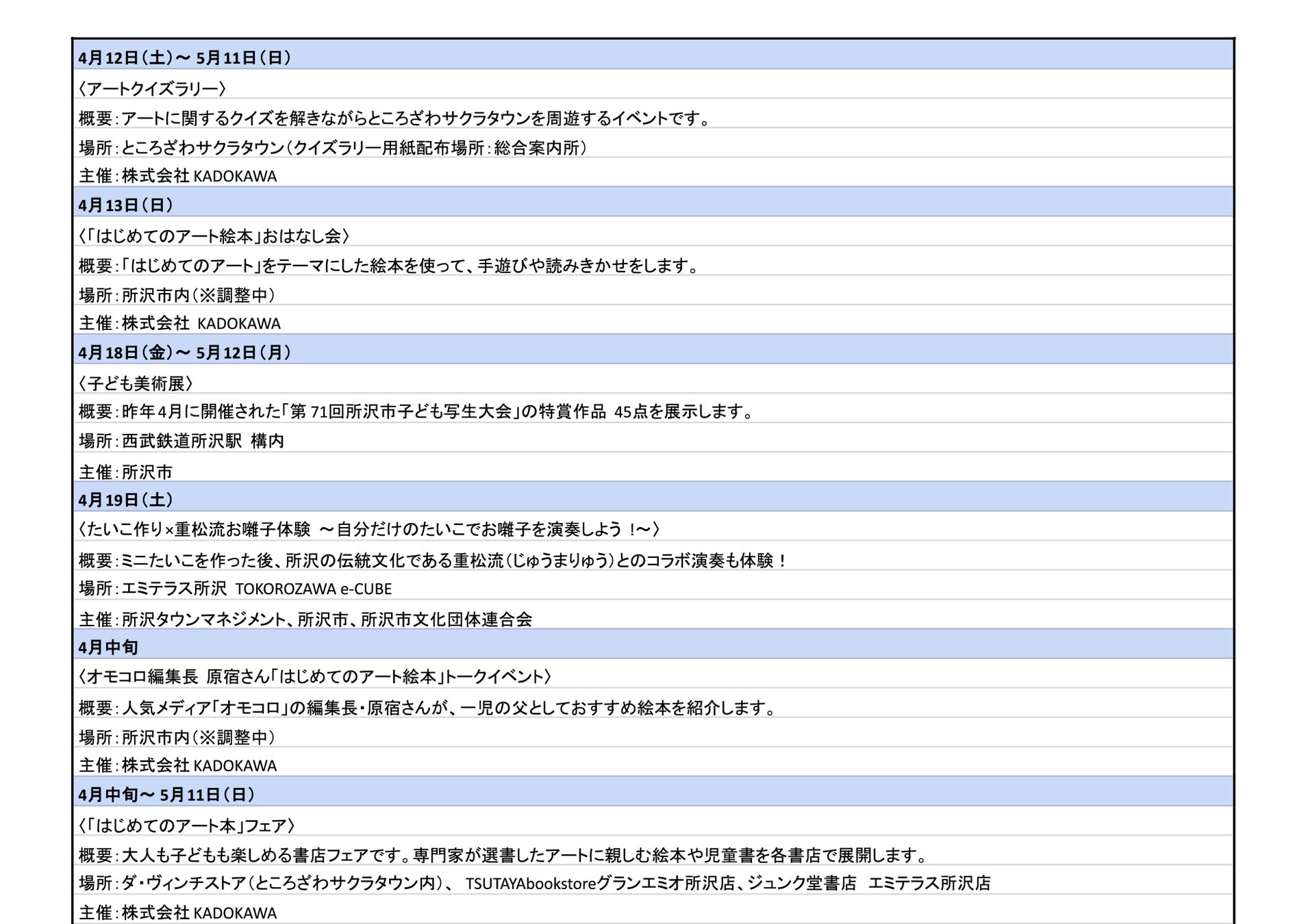 株式会社 KADOKAWA(本社:東京都千代田区、取締役 代表執行役社長 CEO:夏野剛)が参画する所沢子ども芸術祭実行委員会は、2025年4月12日(土)~5月11日(日)にかけて、埼玉県所沢市において「所沢子ども芸術祭」(略称:TKG)を初開催いたします。