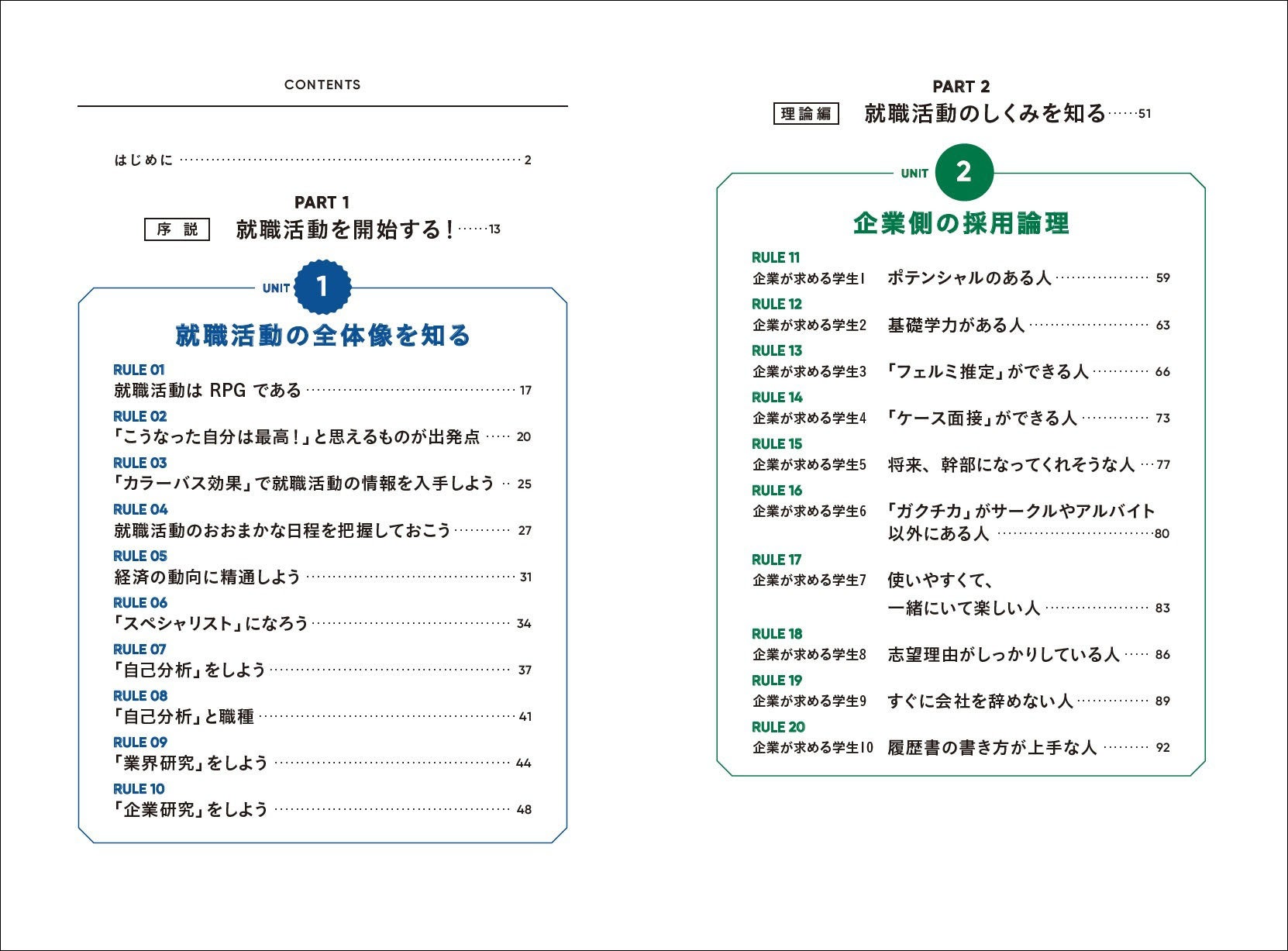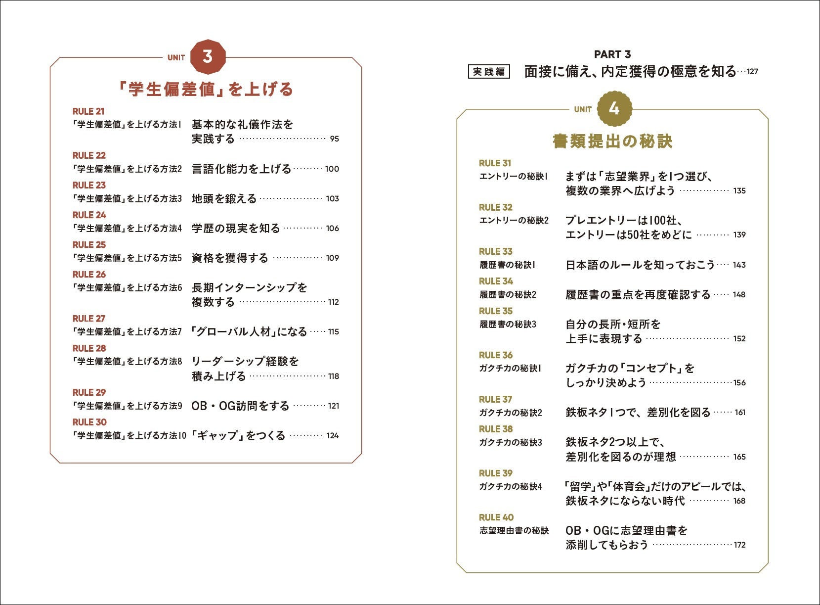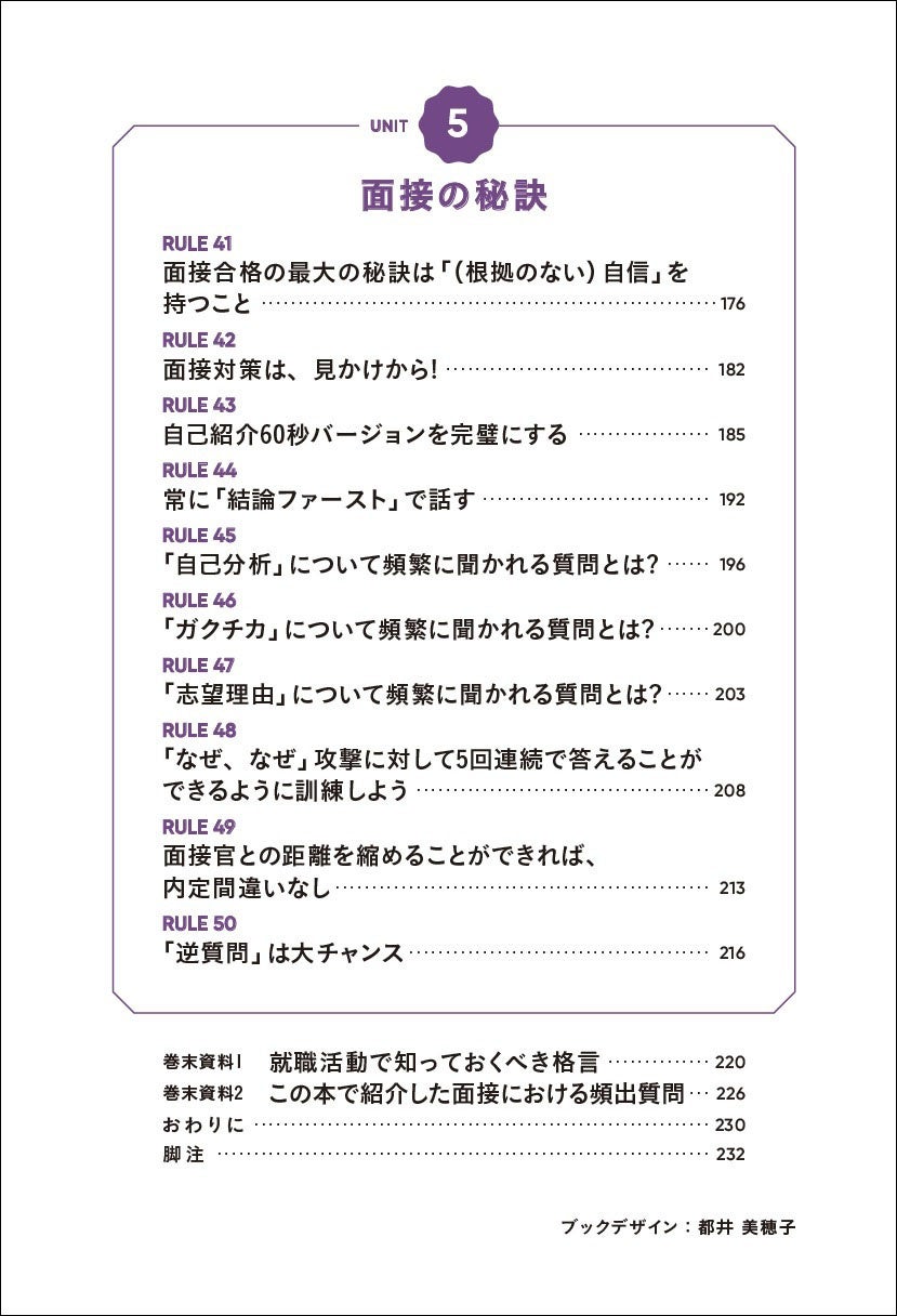 本書では、そんな「就活の秘訣」を50のルールに分けて解説。その内容は、就職活動の基本的な情報から、企業側の採用論理、それに基づく志望理由書の書き方や、面接での答え方・振る舞いまで多岐にわたります。